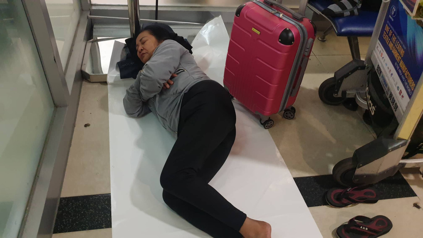 Người phụ nữ nằm ngủ tại sân bay vì phải đợi quá lâu nên mệt mỏi..