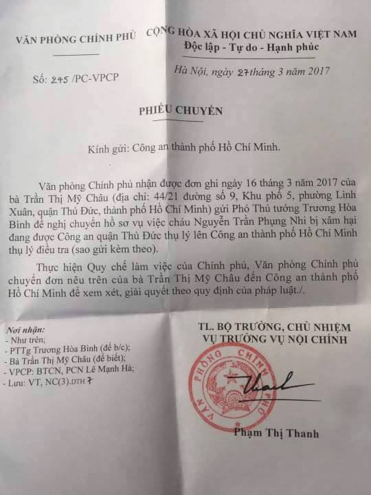 Trong phiếu chuyển số 245/PC-VPCP ngày 27/3, Văn phòng Chính phủ nhận được đơn ghi ngày 16/3 của bà T.T.M.C (quận Thủ Đức) gửi Phó Thủ tướng Trương Hòa Bình đề nghị chuyển hồ sơ vụ việc cháu N.T.P.N bị xâm hại đang được Công an quận Thủ Đức thụ lý lên Công an TPHCM thụ lý điều tra.