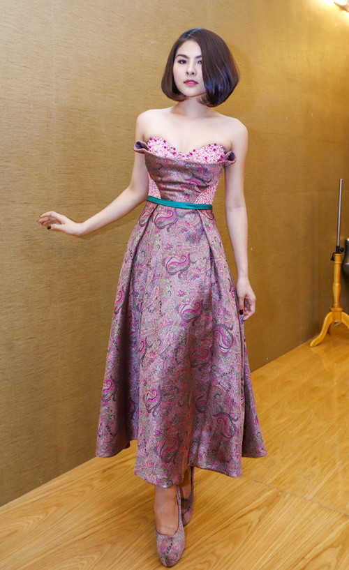 Cuối tuần qua, cô ghé thăm showroom của nhà thiết kế Hoàng Hải tại TP HCM để thử đồ. Cô rất ưng ý với những bộ váy sang trọng, gợi cảm.