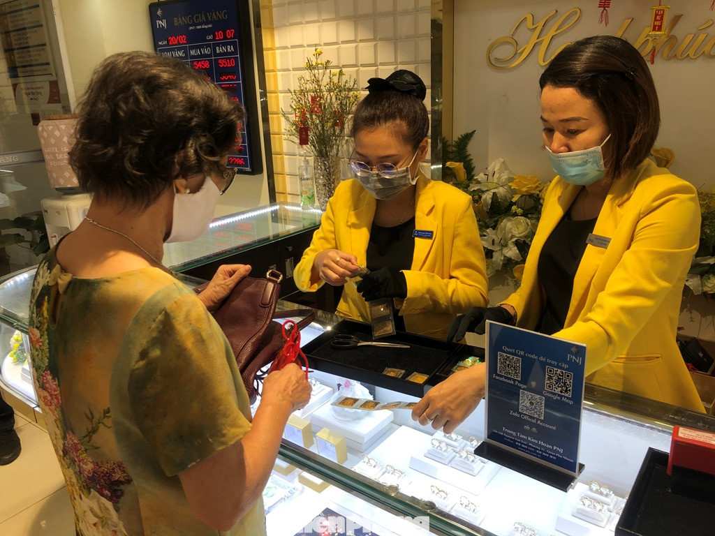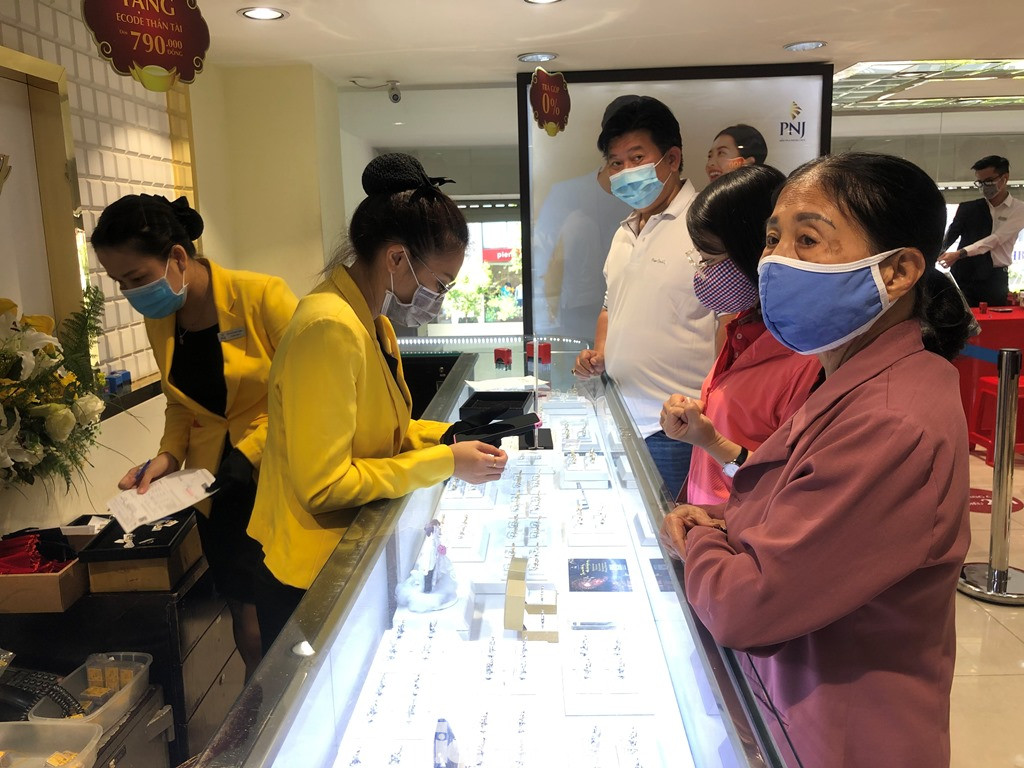 Rửa tay sát khuẩn, khẩu trang sẵn sàng. Các tiệm vàng cũng yêu cầu khách chấp hàng các biện phòng dịch COVID-19, nếu khách không chấp nhận, tiệm vàng kiên quyết không phục vụ.