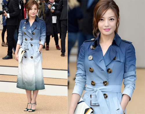 Triệu Vy trang điểm tự nhiên, phối đồ sang trọng và thanh lịch, khi làm khách mờiTuần thời trang London Xuân Hè 2015.