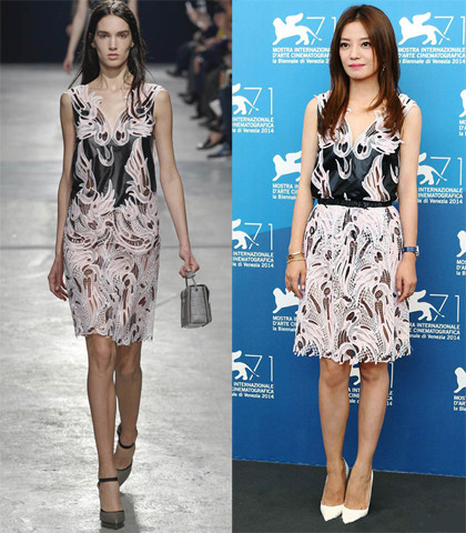 Sử dụng thắt lưng khi mặc váy Christopher Kane đồng thời chọn đôi giày tắng, Triệu Vy mang tới vẻ đẹp khác so với người mẫu khi trình diễn.