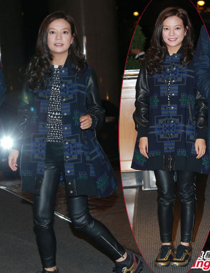 Áo khoác váy kết hợp sandals cùng tông màu là cách phối đơn giản giúp Triệu Vy trông thon thả, sang trọng hơn.