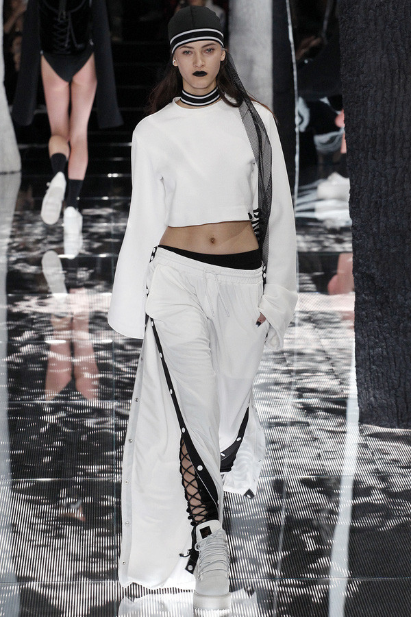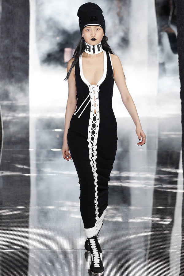 Những đường dây buộc chạy dọc cơ thể tạo sự gợi cảm, phối cùng giầy sneaker mang đến một sự kết hợp đầy thú vị