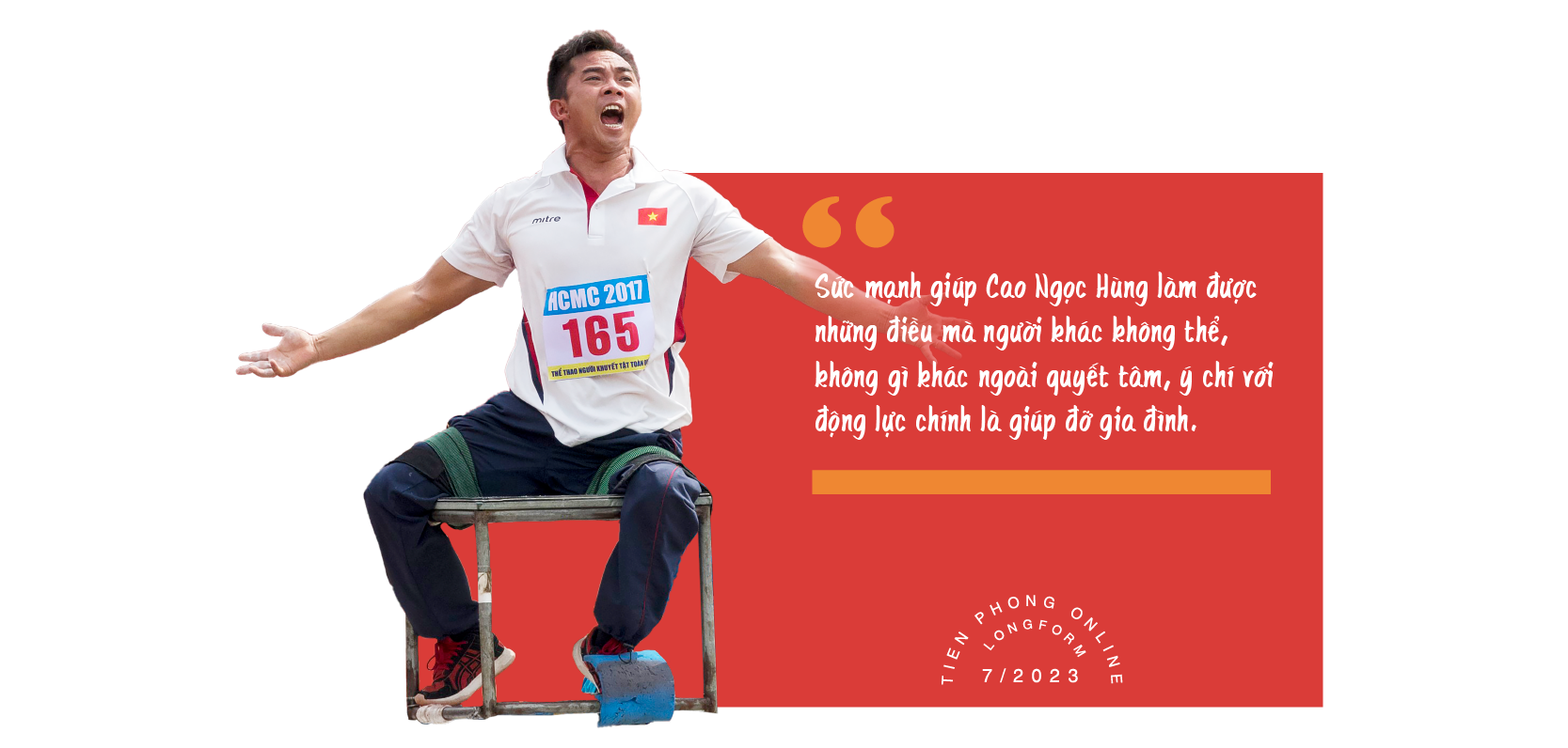 Nếu nói về tố chất thể thao, có lẽ Hùng không có. Nhưng cậu chơi bằng quyết tâm, ý chí với gia đình là động lực. Đó là cách để Hùng gây tiếng vang ở giải trẻ người khuyết tật châu Á, giành liền 3 huy chương Vàng chạy 100m, nhảy xa và ném lao đứng. Ngoài những tấm huy chương lấp lánh, Hùng còn mang về cho bố mẹ 2 triệu 350 ngàn tiền thưởng. Cậu đưa cho ba mẹ, chỉ xin giữ lại để liên hoan bạn bè, mua vài dụng cụ thiết yếu cho tập luyện.