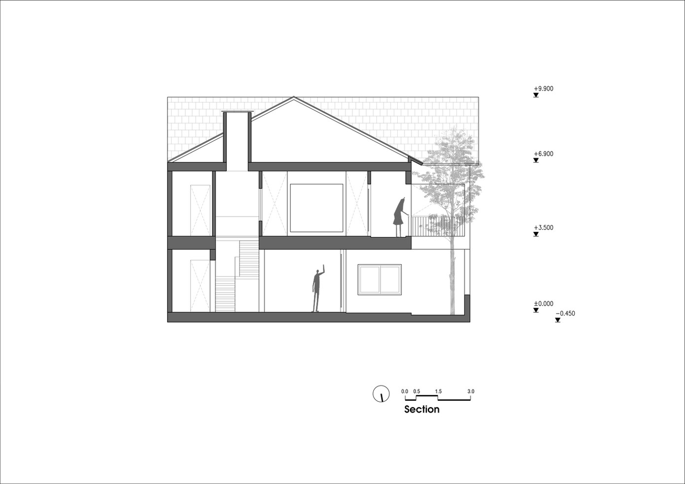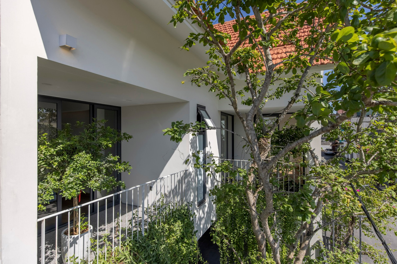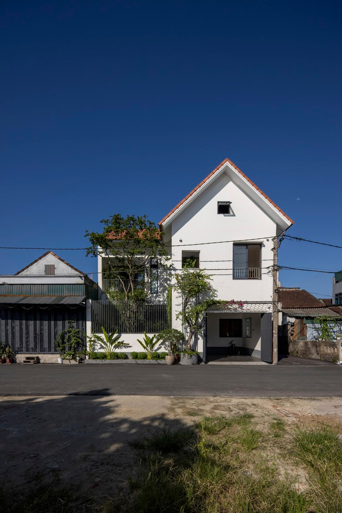 Điểm đặc biệt của ngôi nhà mới là giữ lại tỷ lệ và hình thức mái của ngôi nhà cũ với mái hiên cao 3 mét và hệ mái nghiêng 45 độ, lợp ngói đất nung truyền thống.