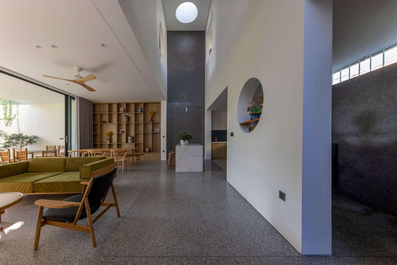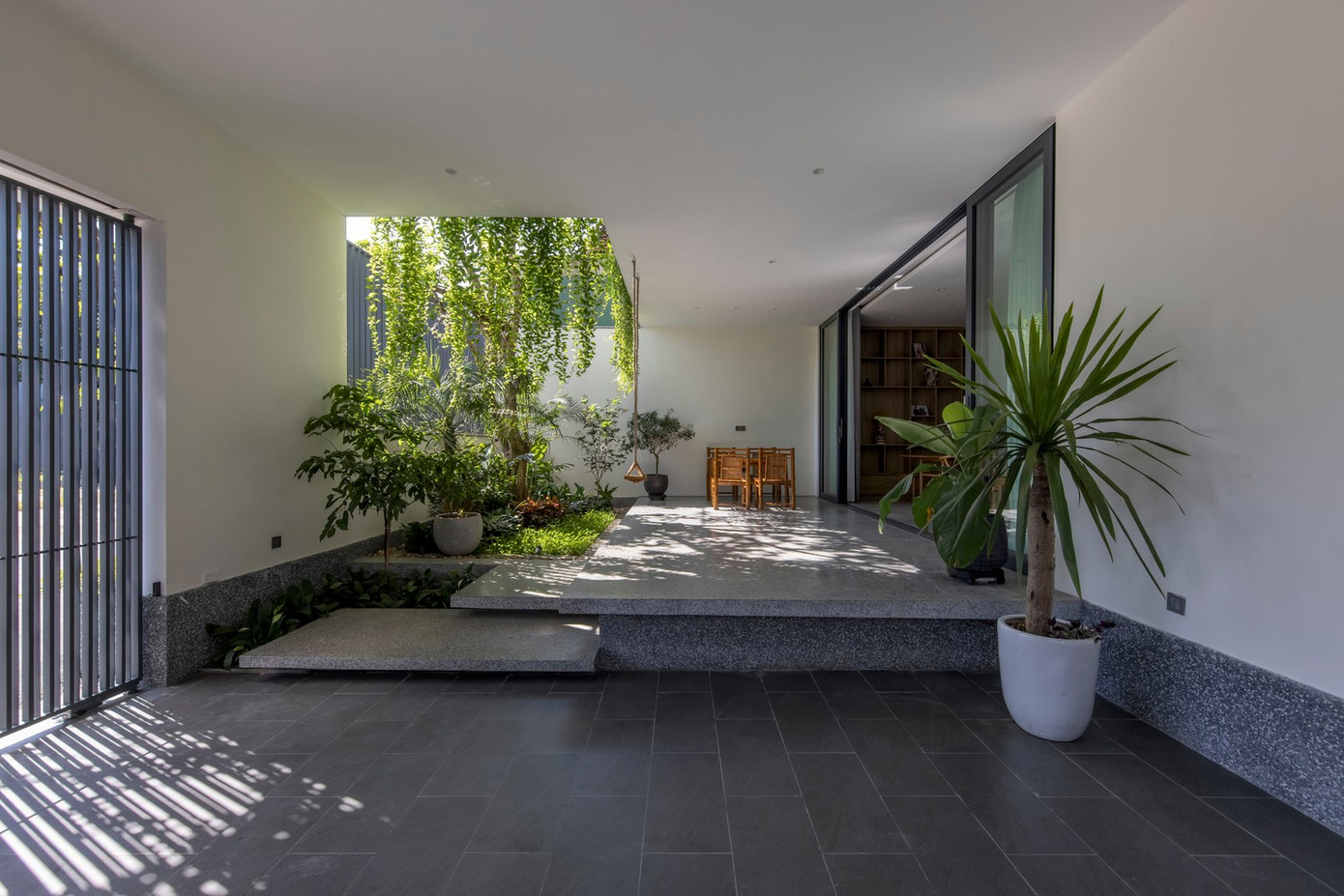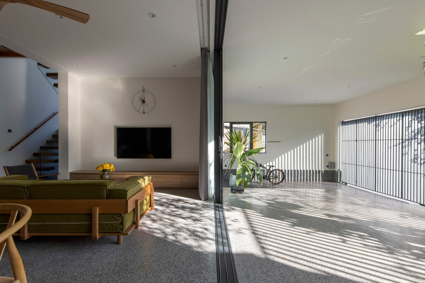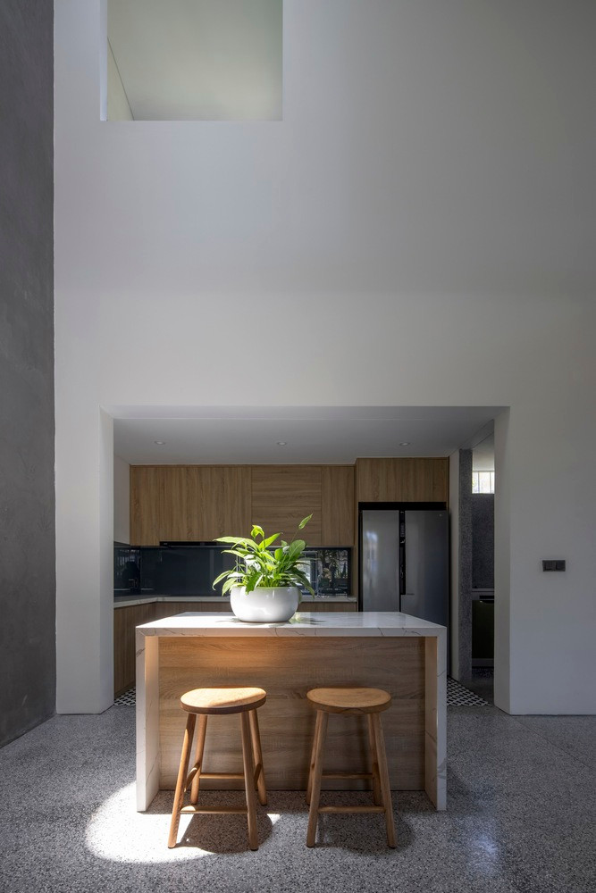 Trong kiến trúc của ngôi nhà cũ, phòng khách và bếp là những không gian riêng biệt mở ra hai sân hiên khác nhau, trong thiết kế mới, một mái hiên chung dài được sử dụng để không gian chung và nhà bếp có thể thông mở, giúp không gian trở nên đơn giản hơn, gắn kết hơn và cởi mở hơn.