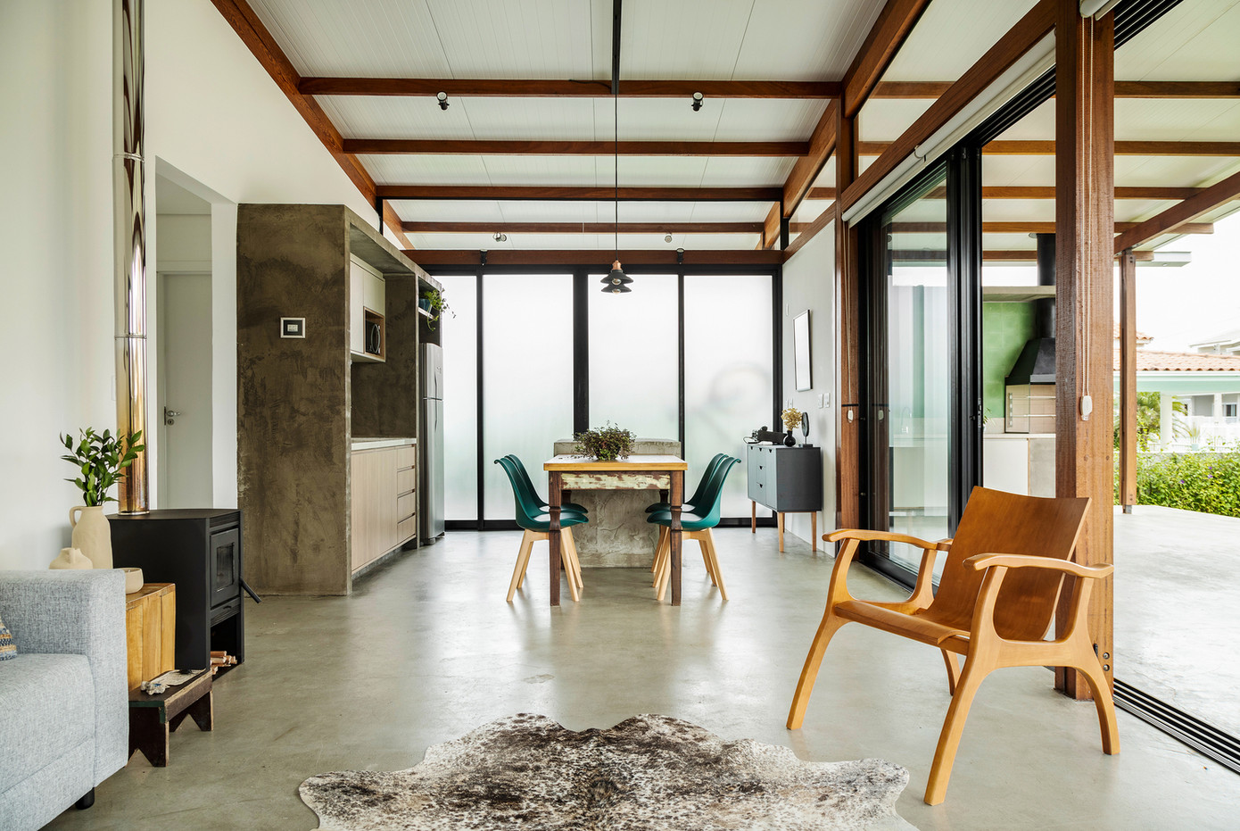 | Một khung lớn cho phép các không gian kết nối với hiên và chiếm ba mô - đun phía trước của ngôi nhà. |
