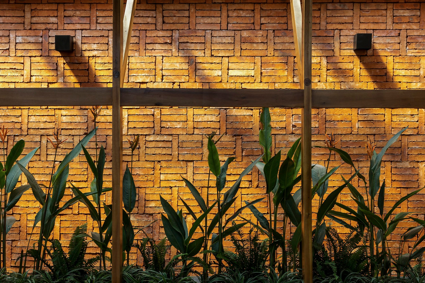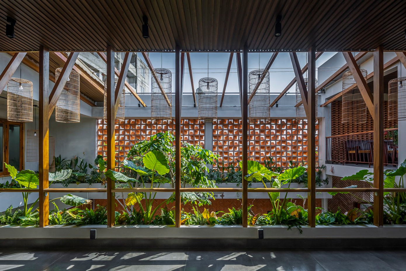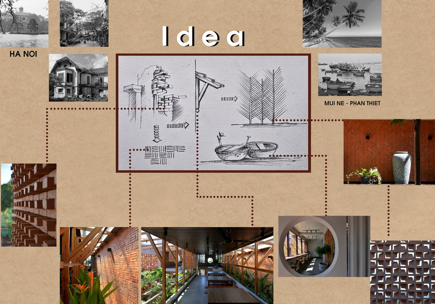 Vì vậy, nhóm thiết kế đã đưa những chất cảm tự nhiên gợi nhớ về những điều bình yên vào thiết kế kiến trúc, ví như nhịp điệu đều đặn và quen thuộc của các bức tường gạch cũ, lá dừa biển, những tấm bê tông thô ráp, tre nứa, gỗ tái sử dụng...