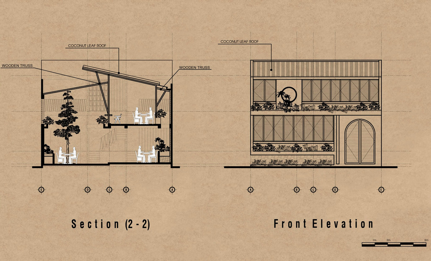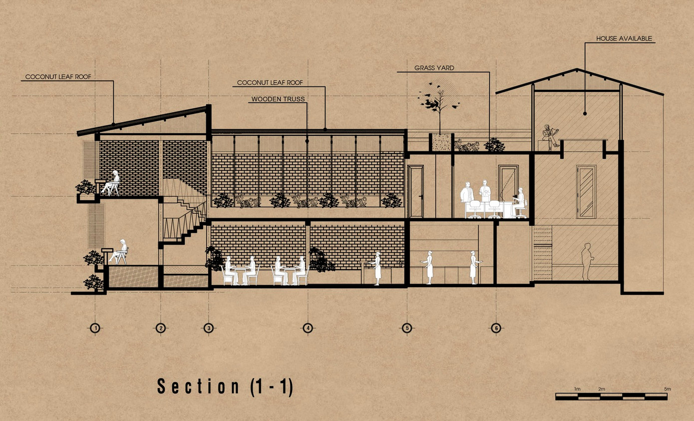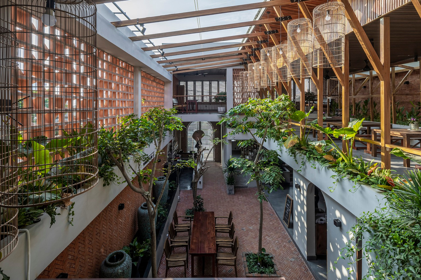 Vì vậy, nhóm thiết kế đã đưa những chất cảm tự nhiên gợi nhớ về những điều bình yên vào thiết kế kiến trúc, ví như nhịp điệu đều đặn và quen thuộc của các bức tường gạch cũ, lá dừa biển, những tấm bê tông thô ráp, tre nứa, gỗ tái sử dụng...