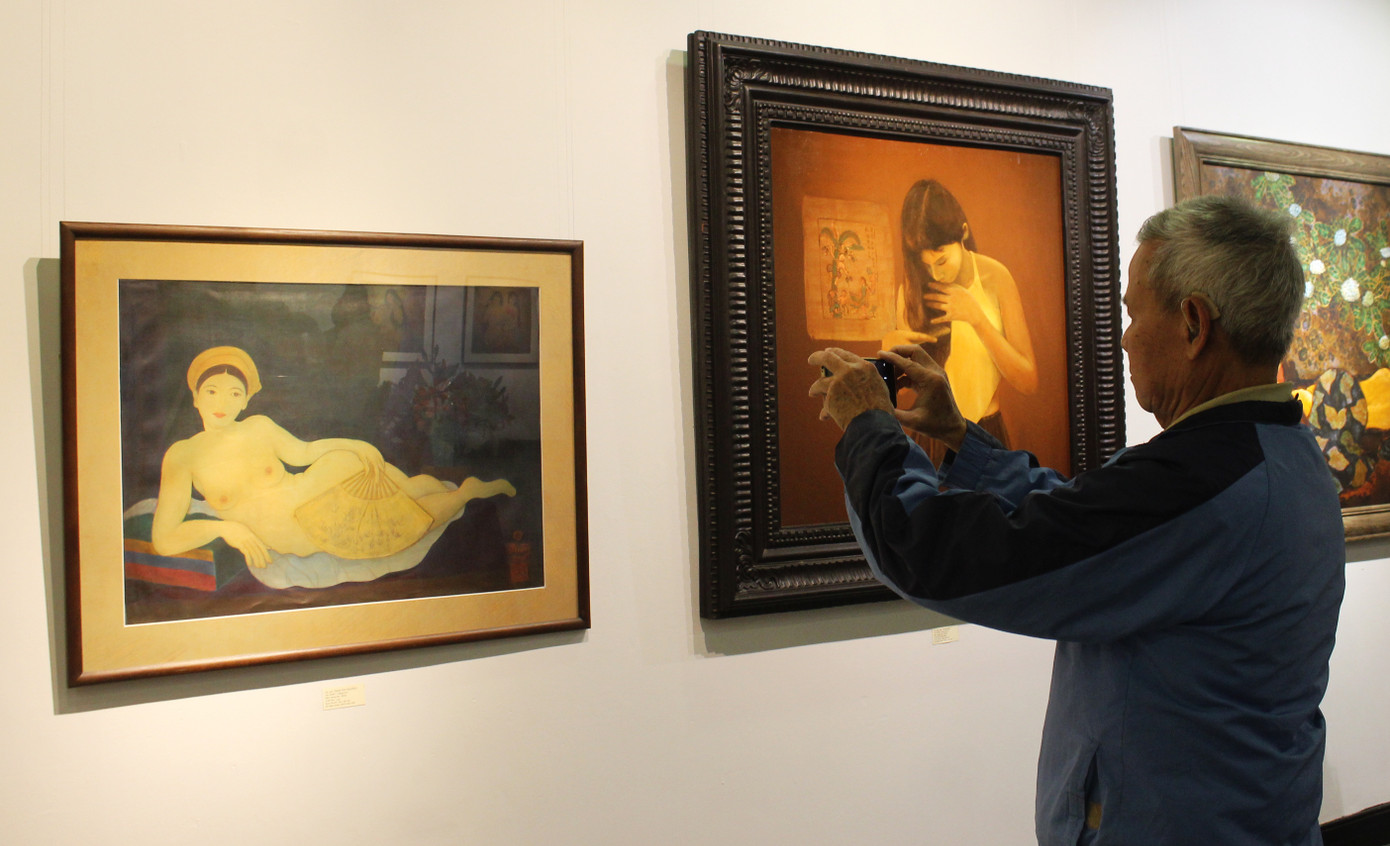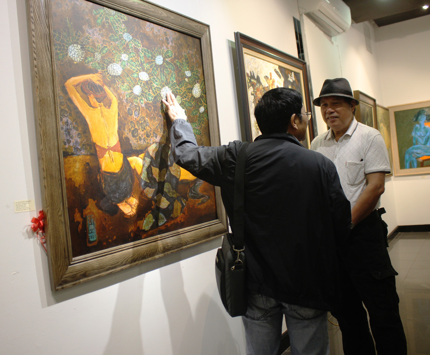 Họa sĩ Hoàng Định đến thăm quan các tác phẩm của đồng nghiệp.