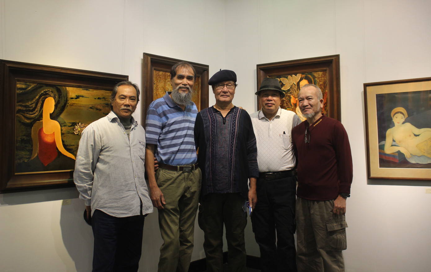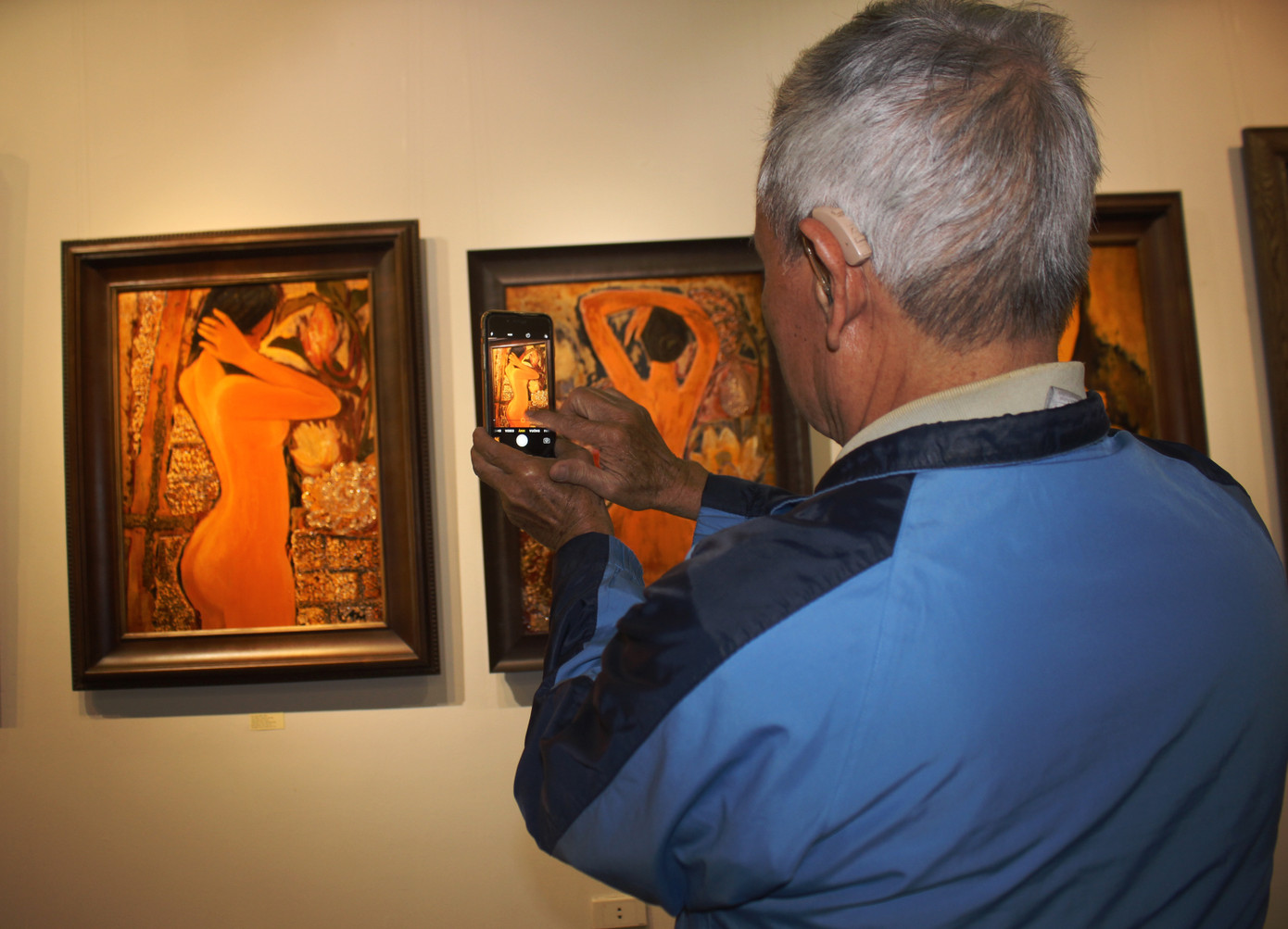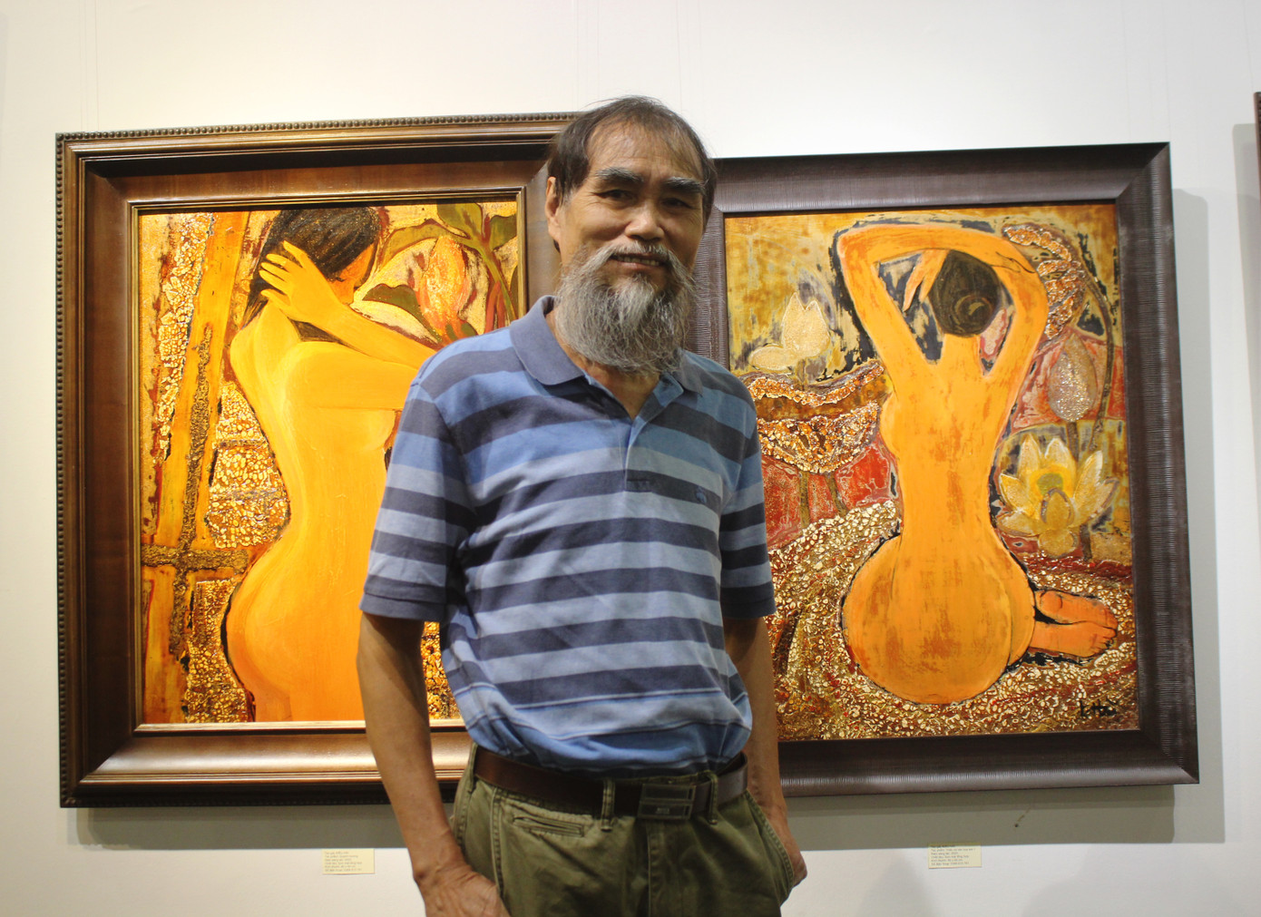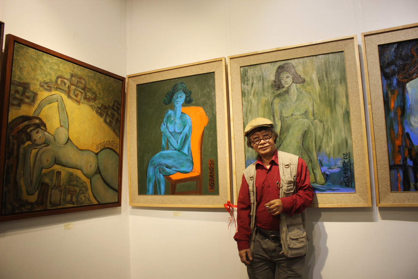 Họa sĩ Nguyễn Đức Sáng bên các tác phẩm nude của mình tại triển lãm.