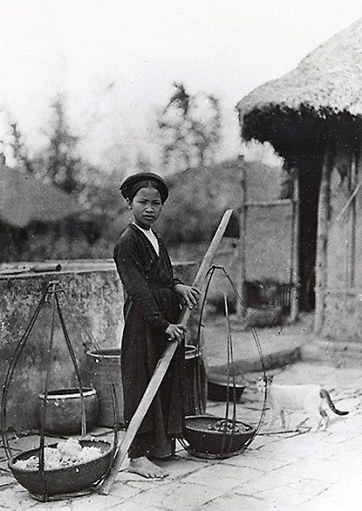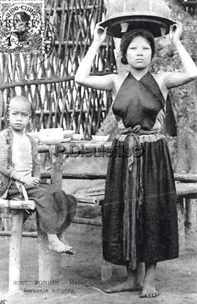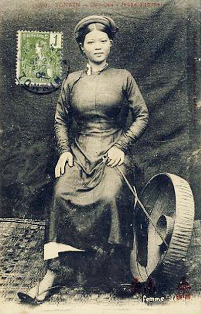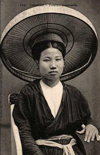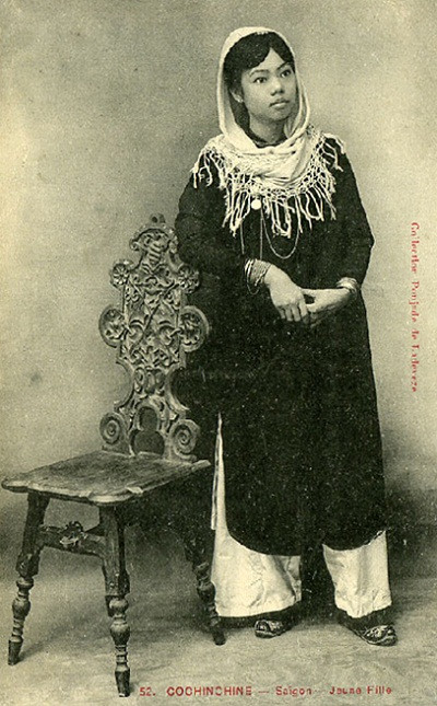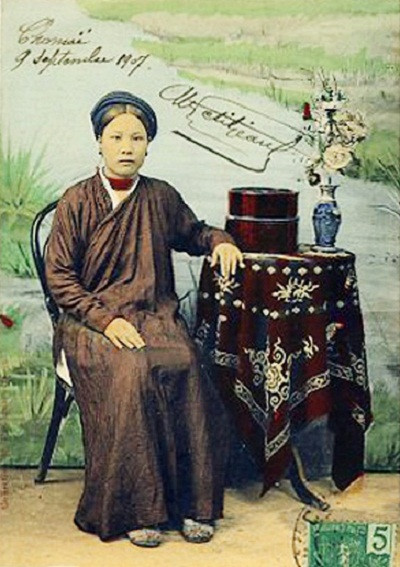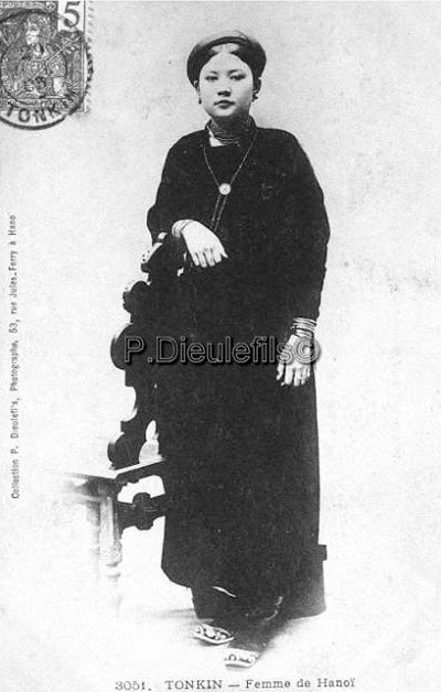 ức ảnh chụp năm 1906 khắc họa một phụ nữ Việt Nam mặc áo dài, đeo kiềng vàng, vấn tóc cao.