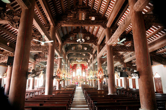 Toàn bộ nội thất thánh đường làm từ lõi gỗ lim, do thợ mộc lành nghề thực hiện.