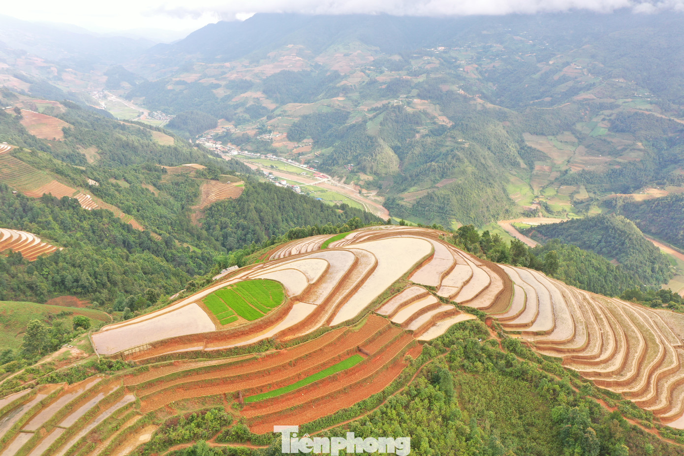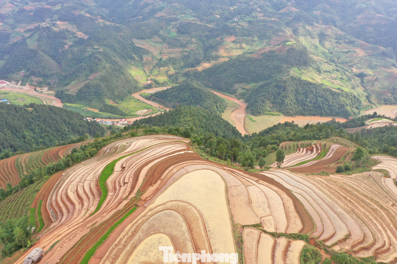 Những thửa ruộng mới cấy xanh rì, đan xen cùng luống đất nâu lóng lánh nước. Ruộng bậc thang là sự kết hợp hoàn hảo giữa vẻ hùng vĩ của núi rừng cùng vẻ đẹp của lao động sáng tạo, trải qua bao đời, bao thế hệ.