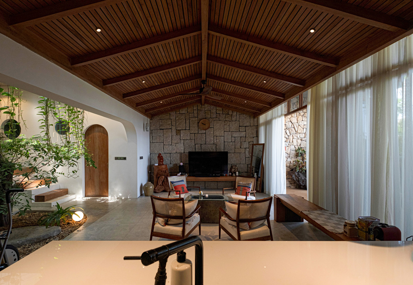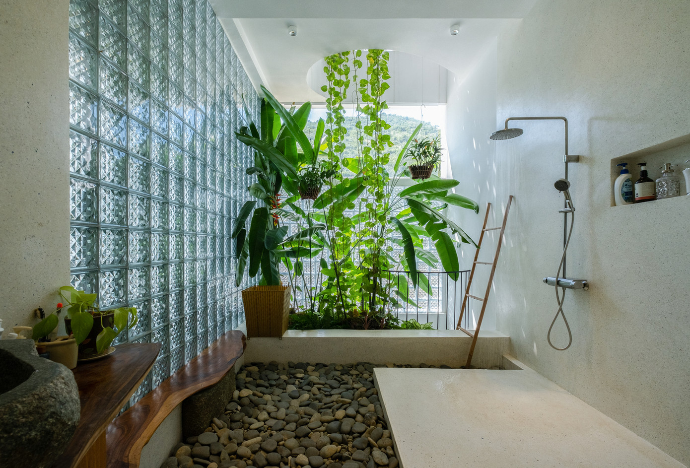 Các chất liệu như đá hộc, sỏi, thủy tinh, gỗ được sử dụng một cách có chiến lược vừa tạo nên tinh thần nhiệt đới vừa có tác dụng thẩm mỹ cho thiết kế.