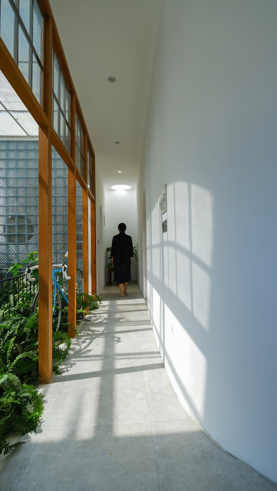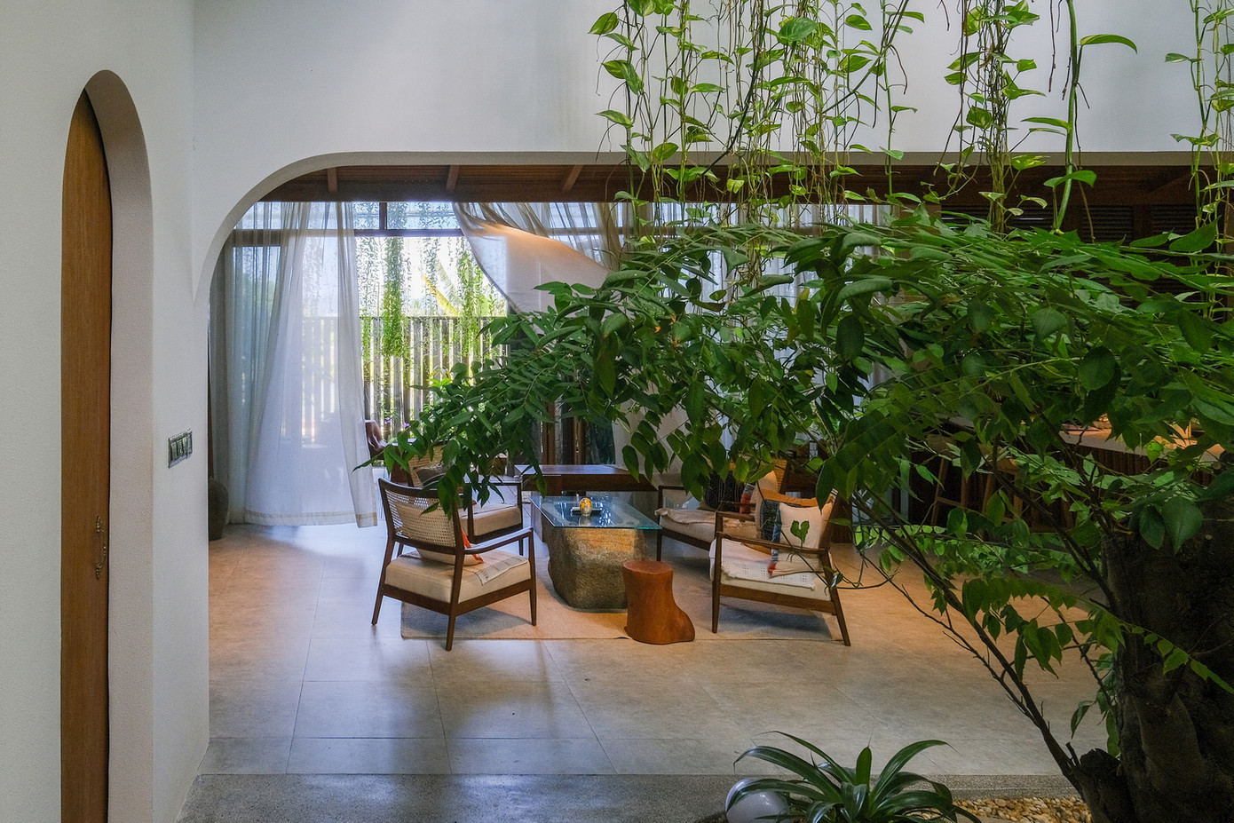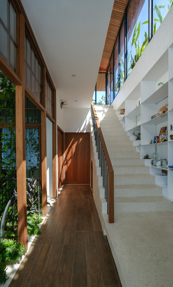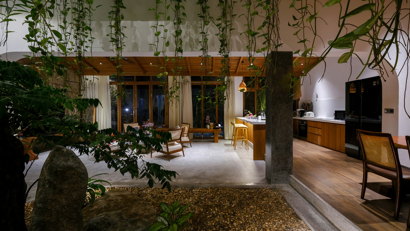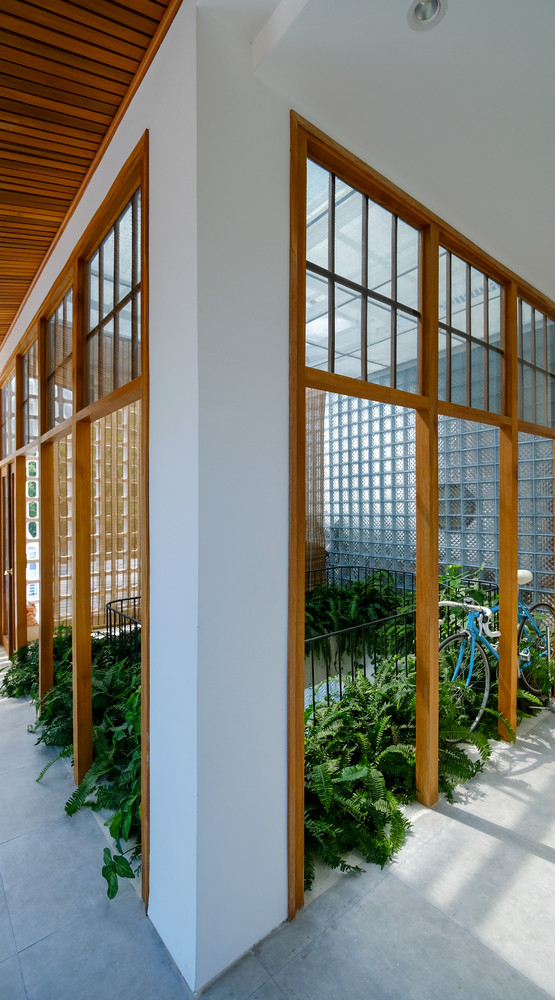 Các khoảng xanh được đan cài khắp các khu vực, kết hợp với ánh sáng tự nhiên lấy từ những khung cửa kính trải dài một mặt nhà cùng giếng trời, không gian trong nhà mang đậm màu sắc nhiệt đới
