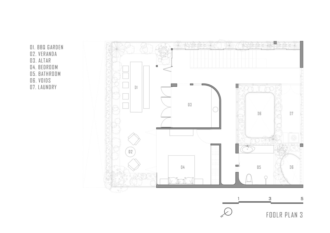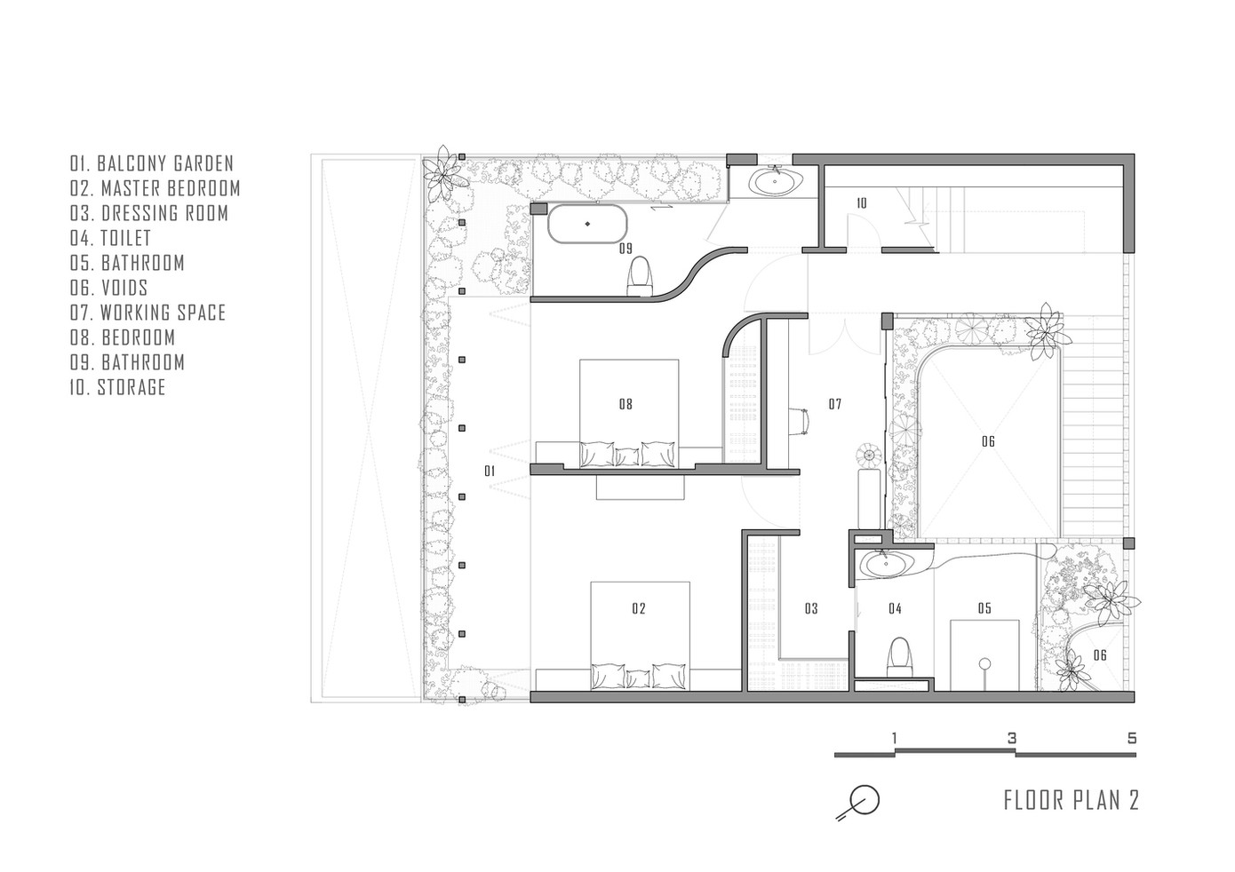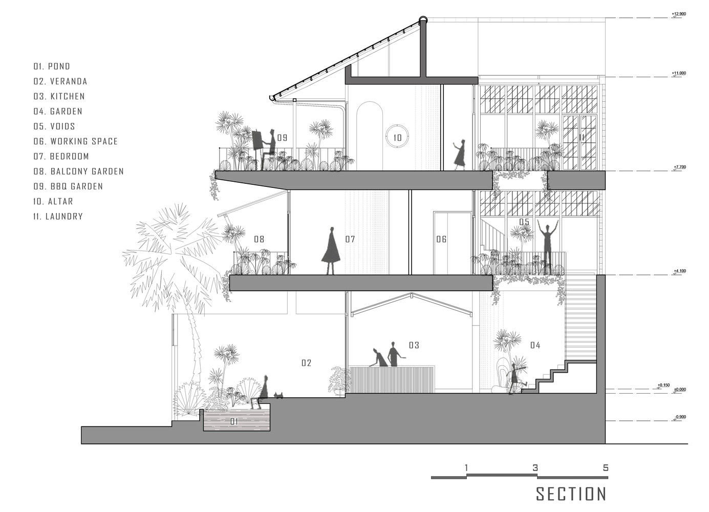 Các khoảng xanh được đan cài khắp các khu vực, kết hợp với ánh sáng tự nhiên lấy từ những khung cửa kính trải dài một mặt nhà cùng giếng trời, không gian trong nhà mang đậm màu sắc nhiệt đới
