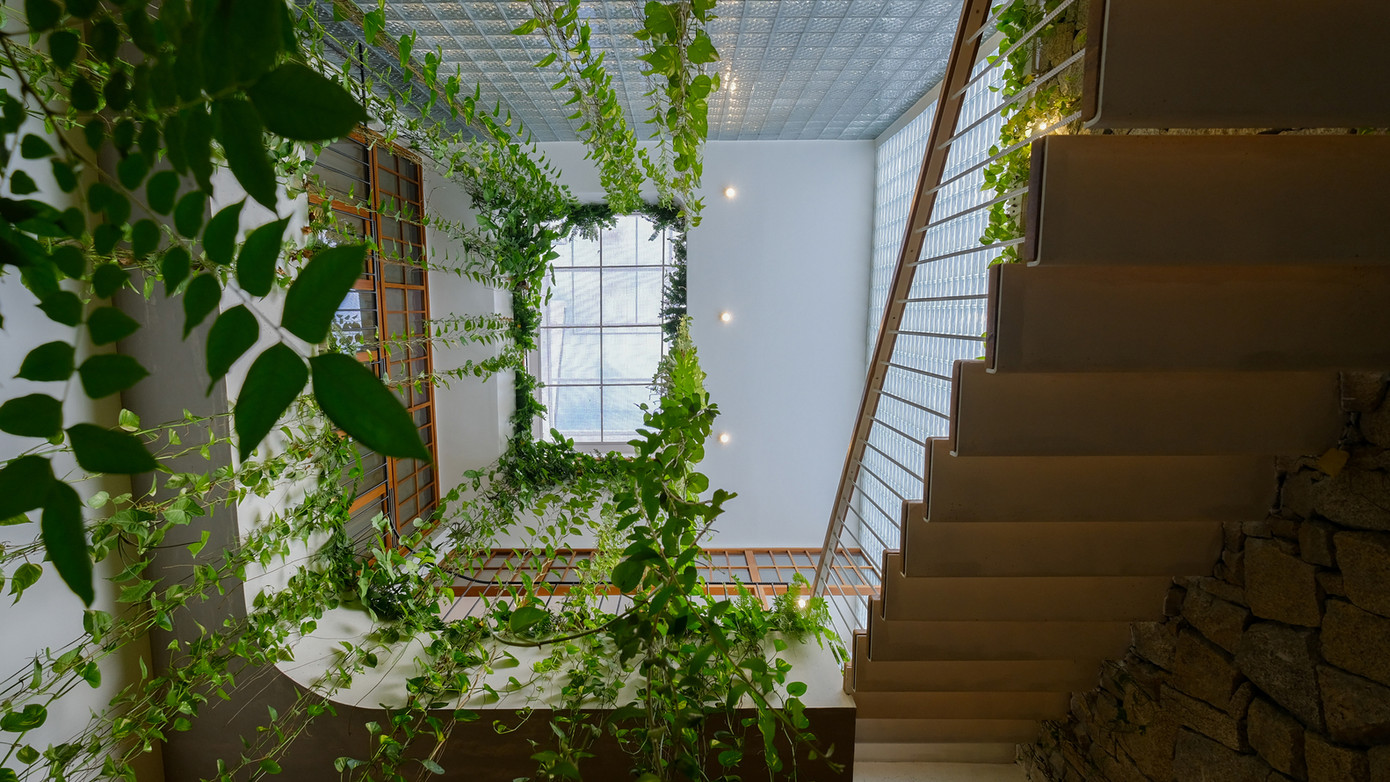 Xung quanh vòm cầu thang các tầng, trầu bà thân leo được trồng thả rũ tạo nên lớp rèm tự nhiên thu hút.