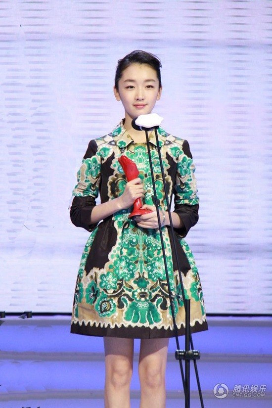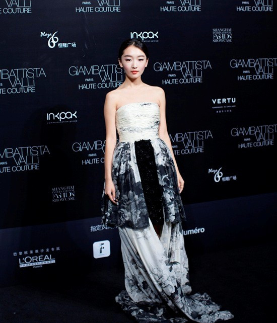 Châu Đông Vũ diện váy dạ hội Haute Couture của hãng Giambattista Valli đi dự LHP quốc tế lần 3 tại Bắc Kinh. Chiếc đầm vàng với phần chân váy xếp nếp nhiều lớp khiến cô đài các.