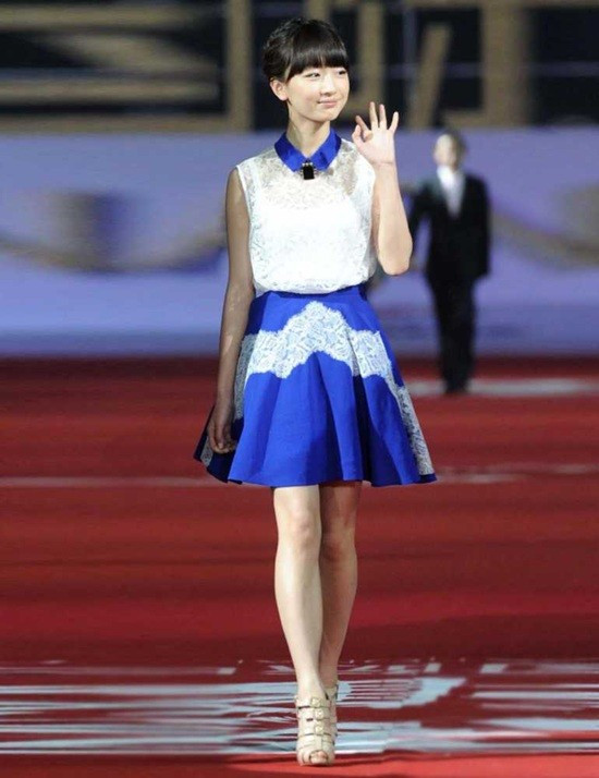 Châu Đông Vũ khá nhỏ bé vì thế cô thường chọn cho mình những chiếc váy ngắn để đánh lừa thị giác về vóc dáng. Thiết kế váy chữ A với những họa tiết đậm chất Á Đông này giúp cô trông cao, thu hút hơn.