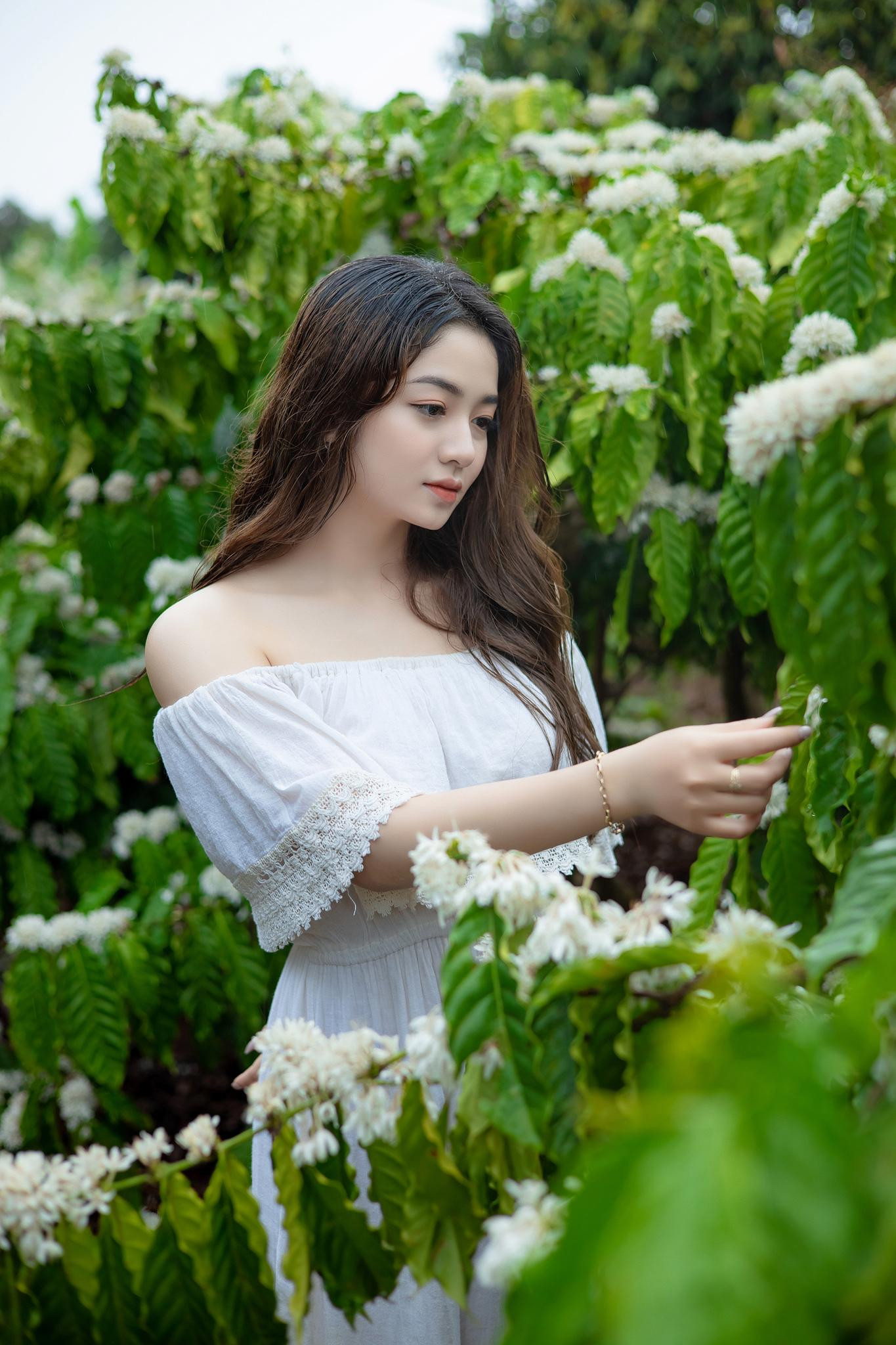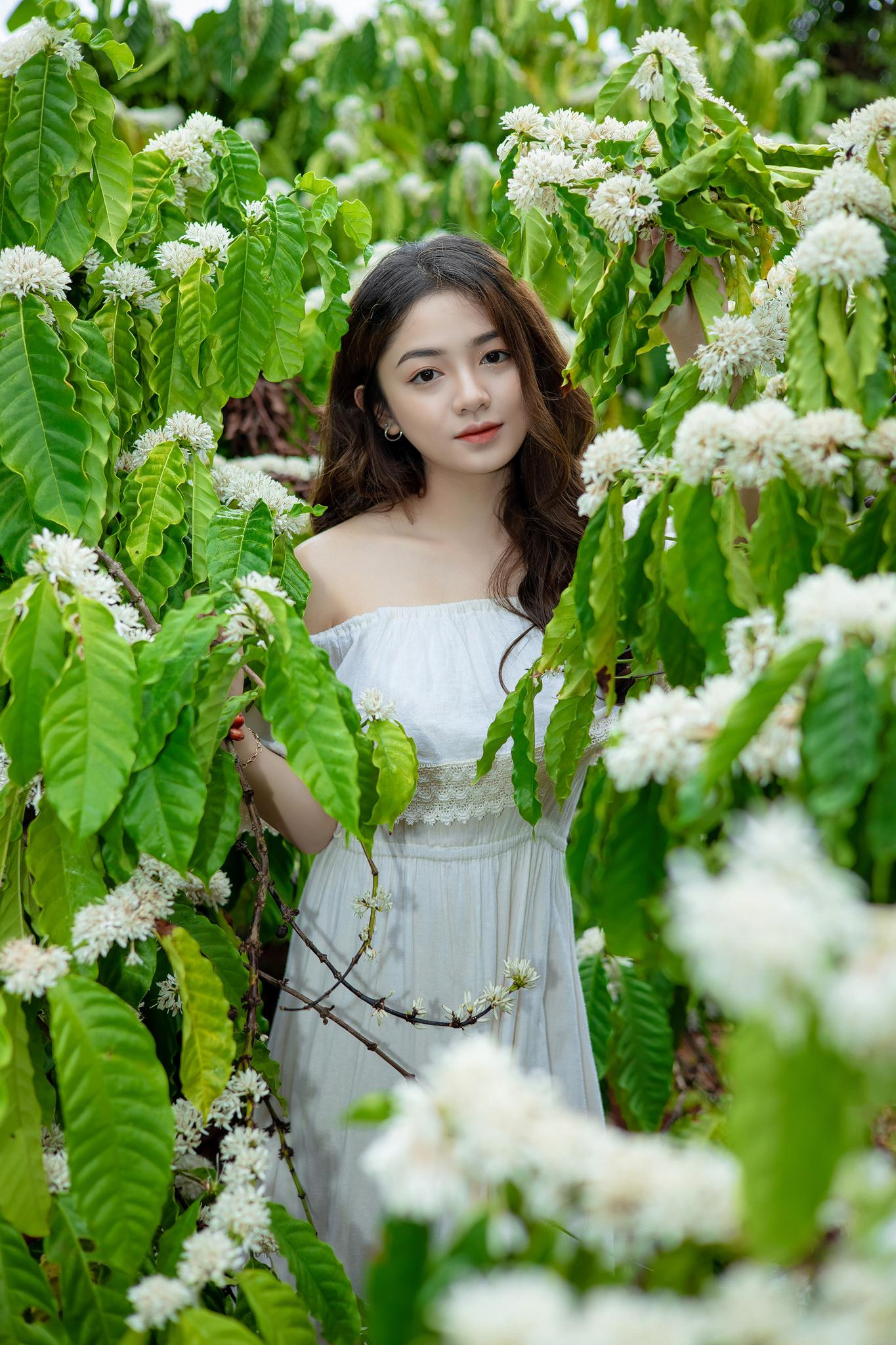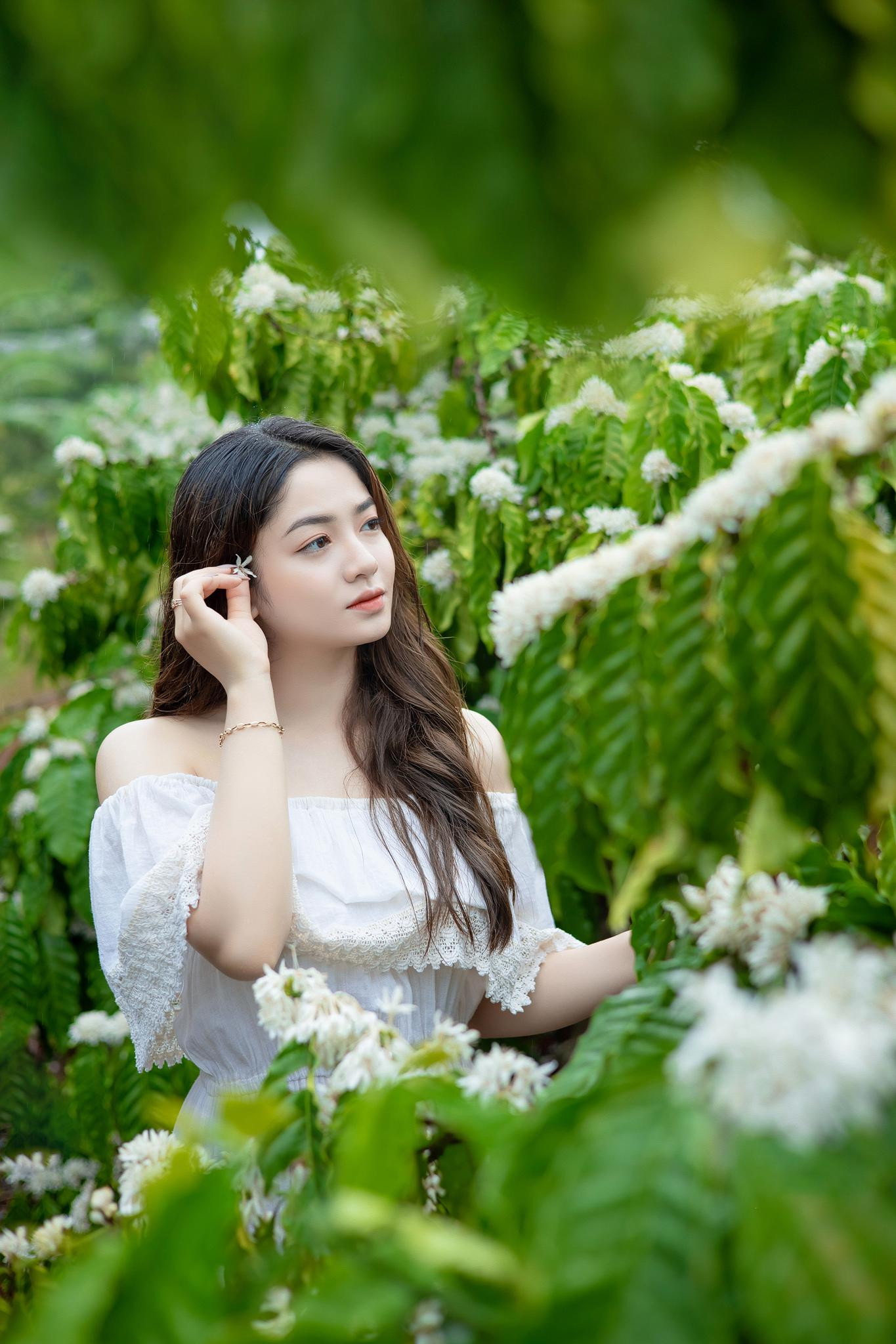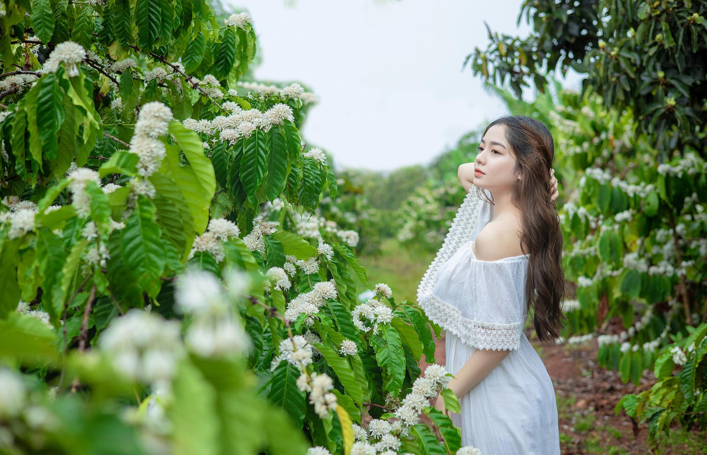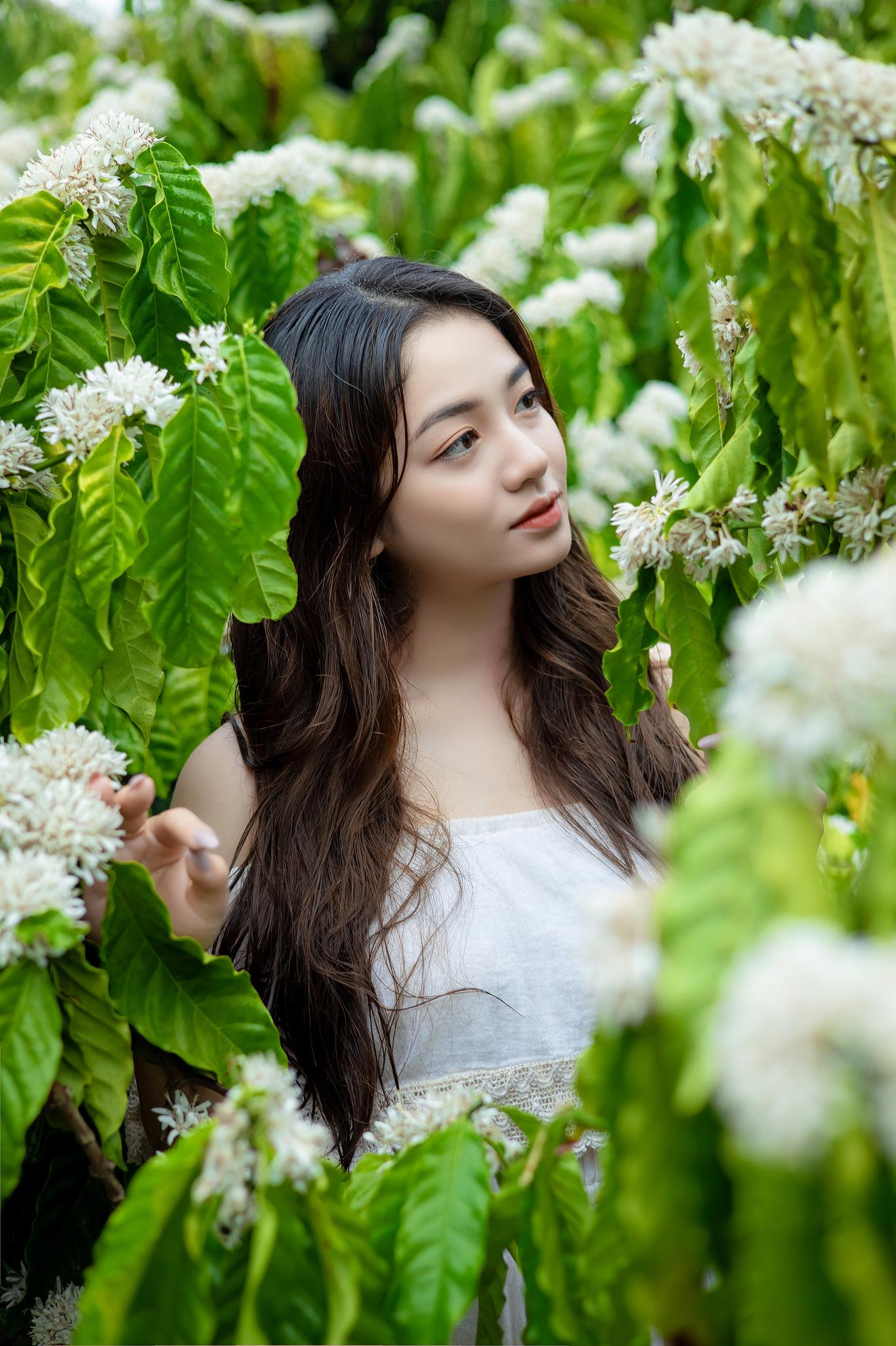 | Vẻ đẹp trong veo của Xuân Trúc trong rừng cà phê mùa hoa nở. |