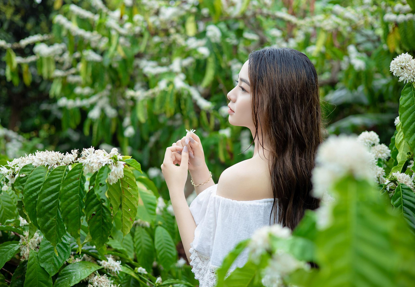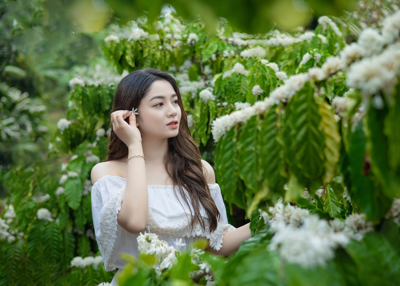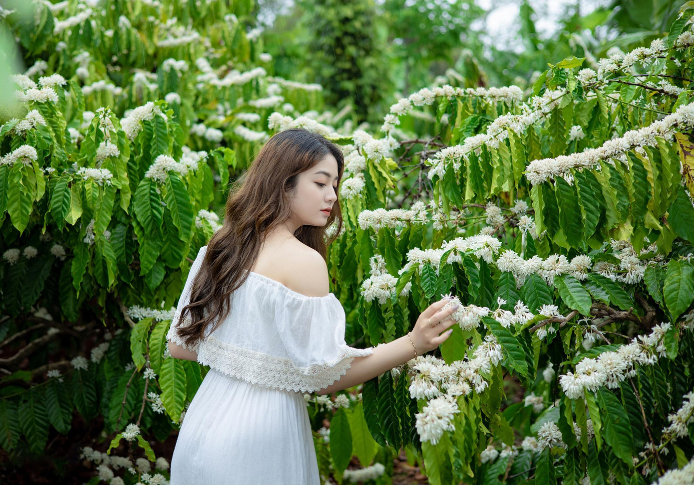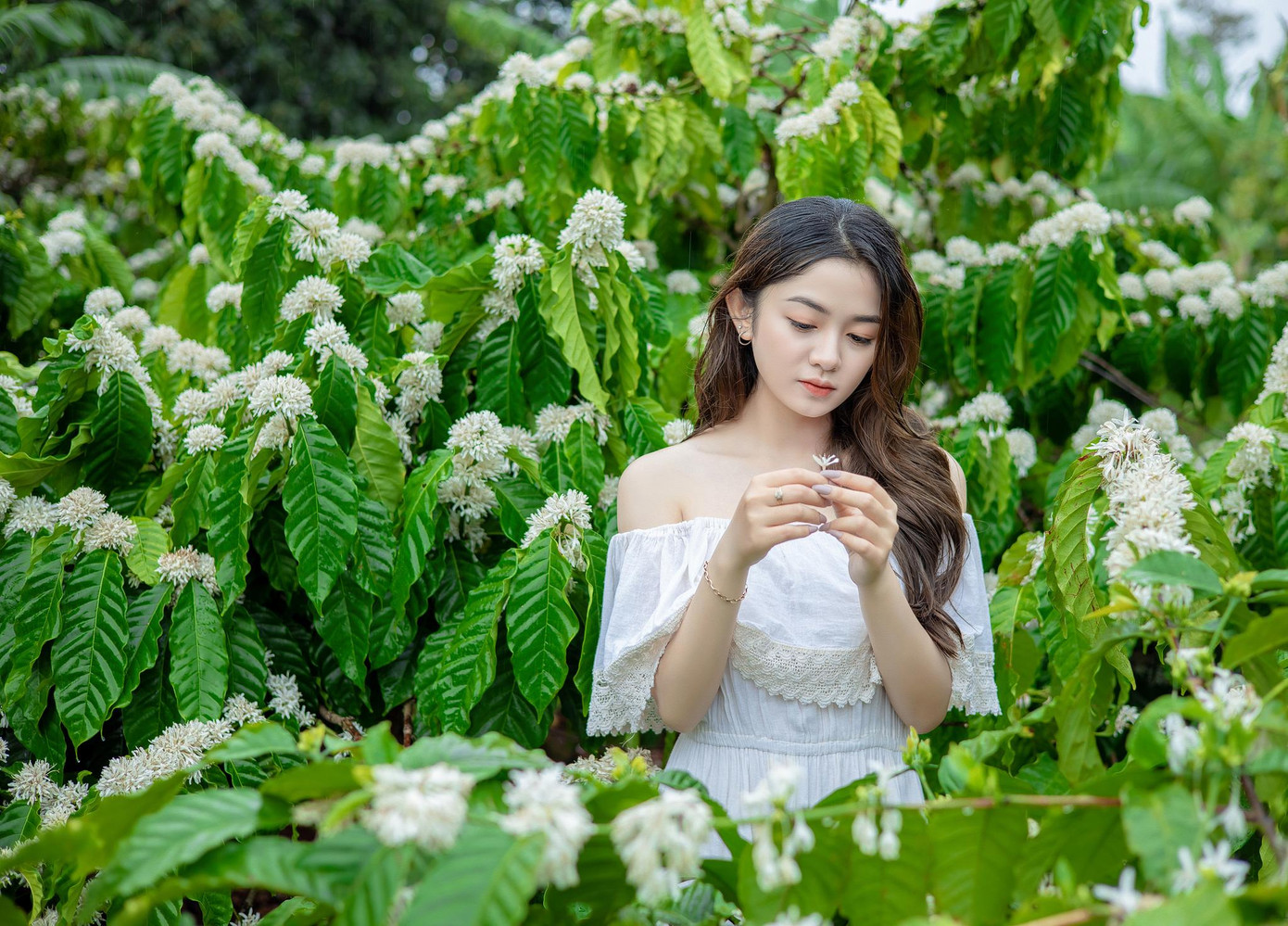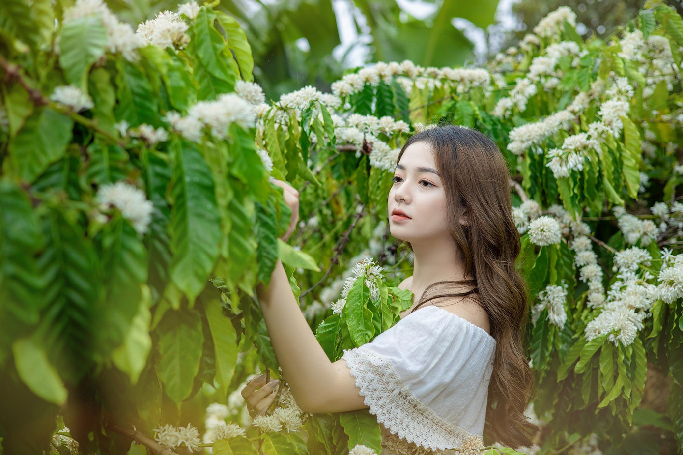 | Vẻ đẹp trong veo của Xuân Trúc trong rừng cà phê mùa hoa nở. |