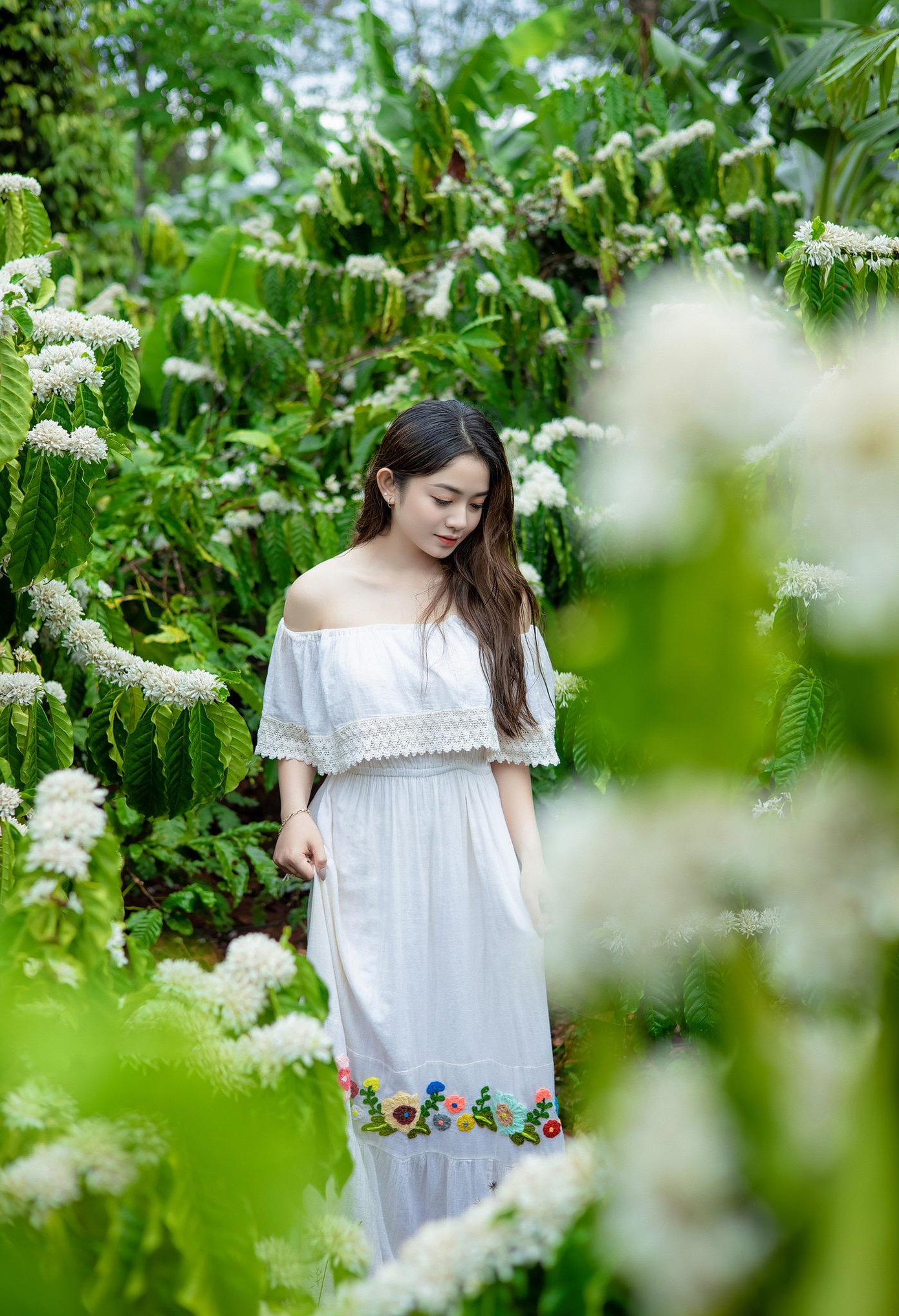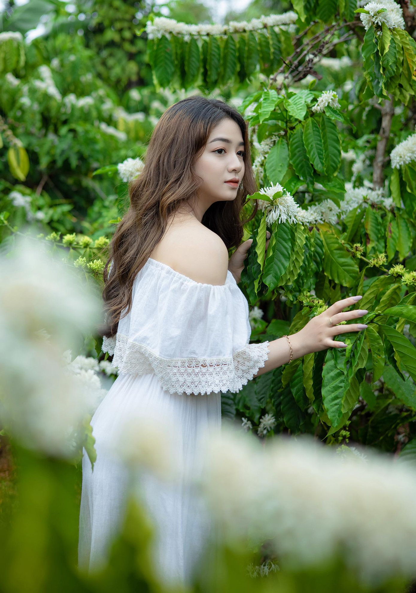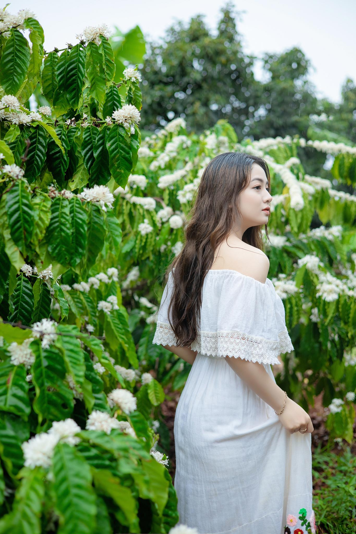 Xuân Trúc chia sẻ: “Nhắc tới Tây Nguyên thì không thể không nhắc tới cây cà phê, nó như gắn liền với cuộc sống của mỗi con người nơi đây. Chính vì thế mình muốn có bộ ảnh với loài hoa vừa độc đáo, vừa thân thuộc, vừa gần gũi này mà không phải đụng hàng ai hết.”