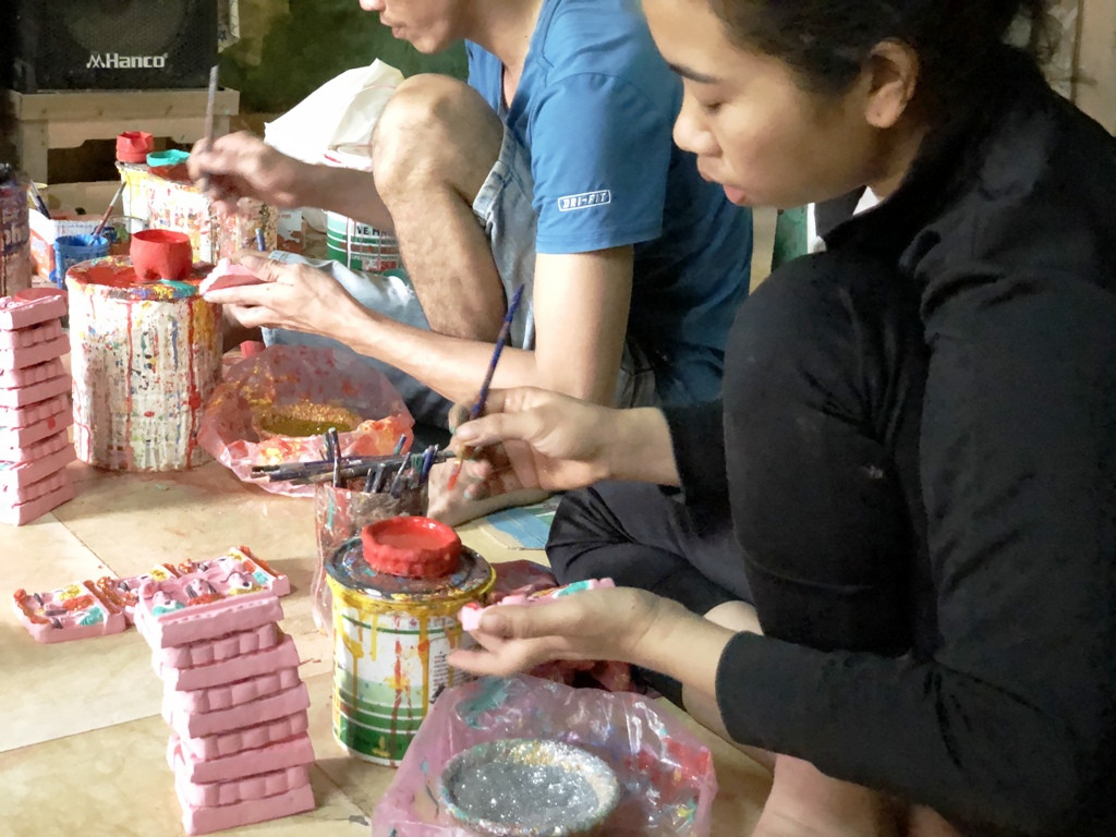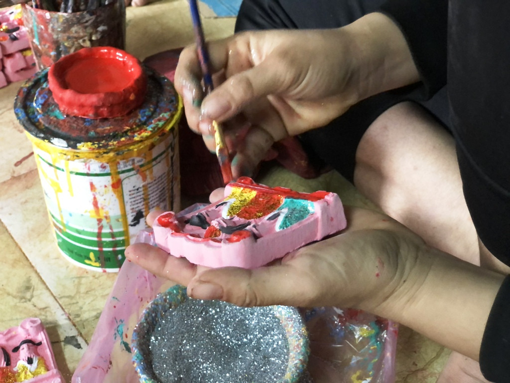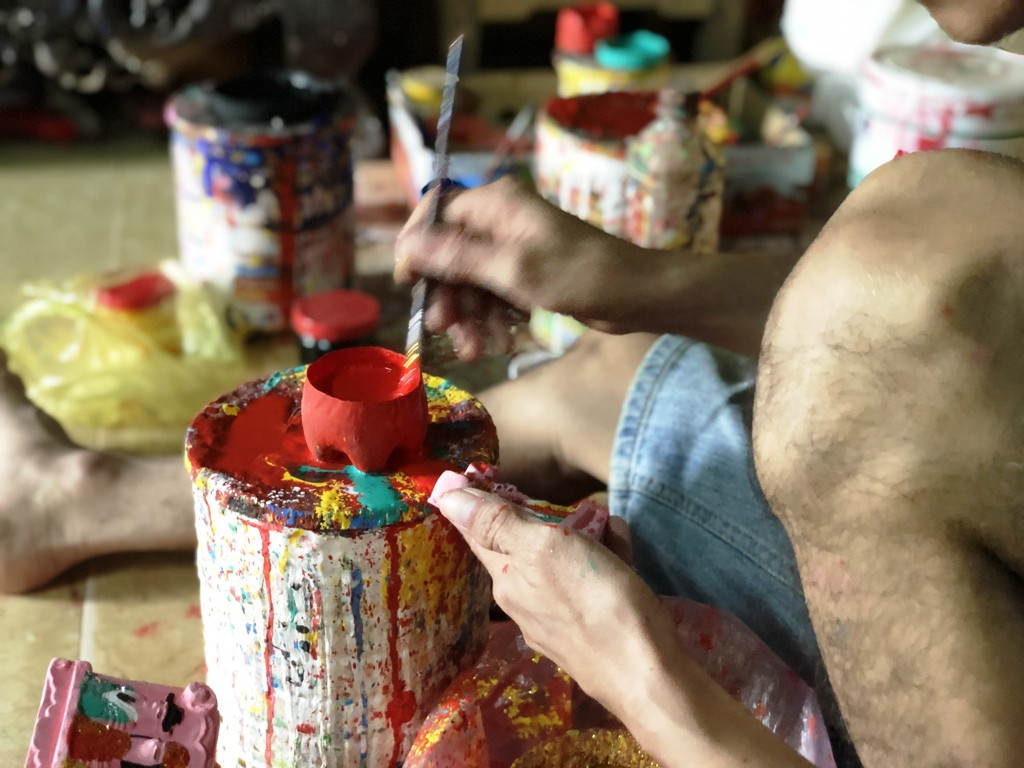 Những bức tượng được làm khô bằng quạt sau đó phết sơn “làm đẹp” và trải qua các khâu trang trí khác, trong đó có việc phủ bột kim tuyến tạo sự bắt mắt. Tuy nhiên, cũng có loại tượng mang độc màu nâu sậm của gỗ.