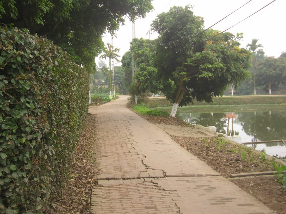 Con đường chính của làng bao quanh chiếc ao làng.