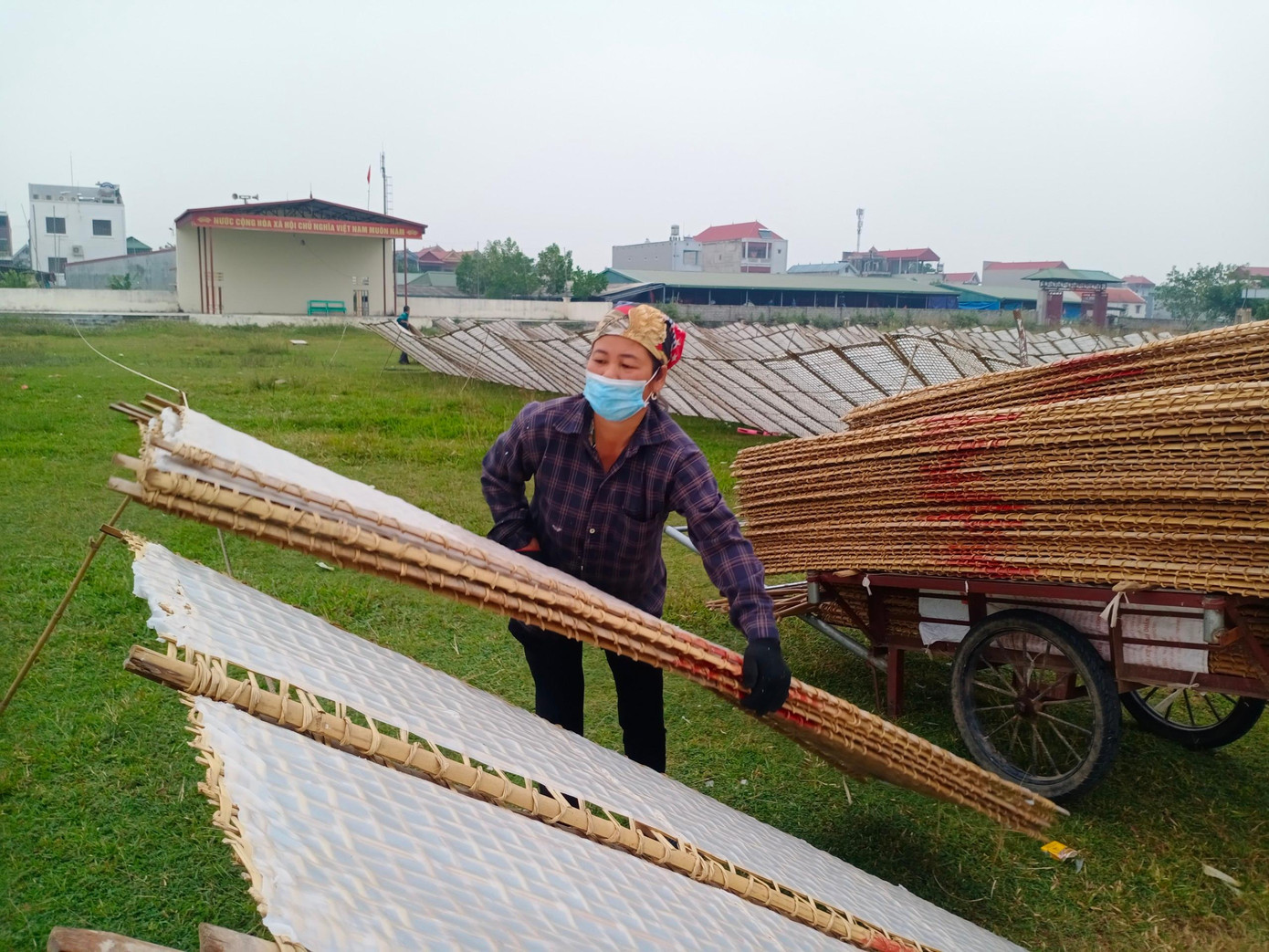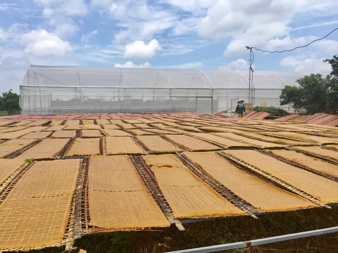 Tráng bánh là công đoạn hết sức công phu. Người có kinh nghiệm mới có thể tráng được những mẻ bánh có độ chín vừa đủ. Nhiệt thấp, bánh không chín, sẽ giòn, dễ gẫy, mỳ ăn sậm sật, nát vụn. Chín quá thì dễ bị rách, mỳ không đẹp. Trong ảnh là mẻ mỳ gạo pha với rau quả.