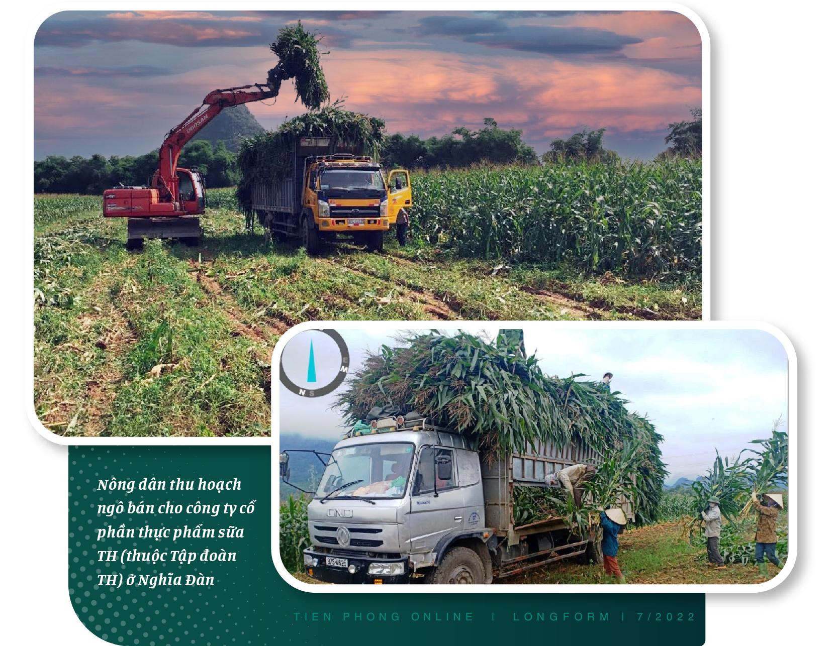 Chúng tôi về Nghĩa Đàn, Nghệ An vào tháng 7. Thời điểm này, hầu hết các tỉnh miền Bắc và miền Trung, nông dân đã bẻ bắp, kết thúc vụ ngô mùa hè. Nhưng đi dọc các xã quanh đường Hồ Chí Minh, gần các trang trại nuôi bò sữa của Công ty cổ phần thực phẩm sữa TH (thuộc Tập đoàn TH) ở Nghĩa Đàn, ngô vẫn bạt ngàn. Chỗ này, ngô vượt quá đầu người, bắp bằng cổ tay; chỗ kia, ngô vừa xuống giống, cây mới cao hơn gang tay.