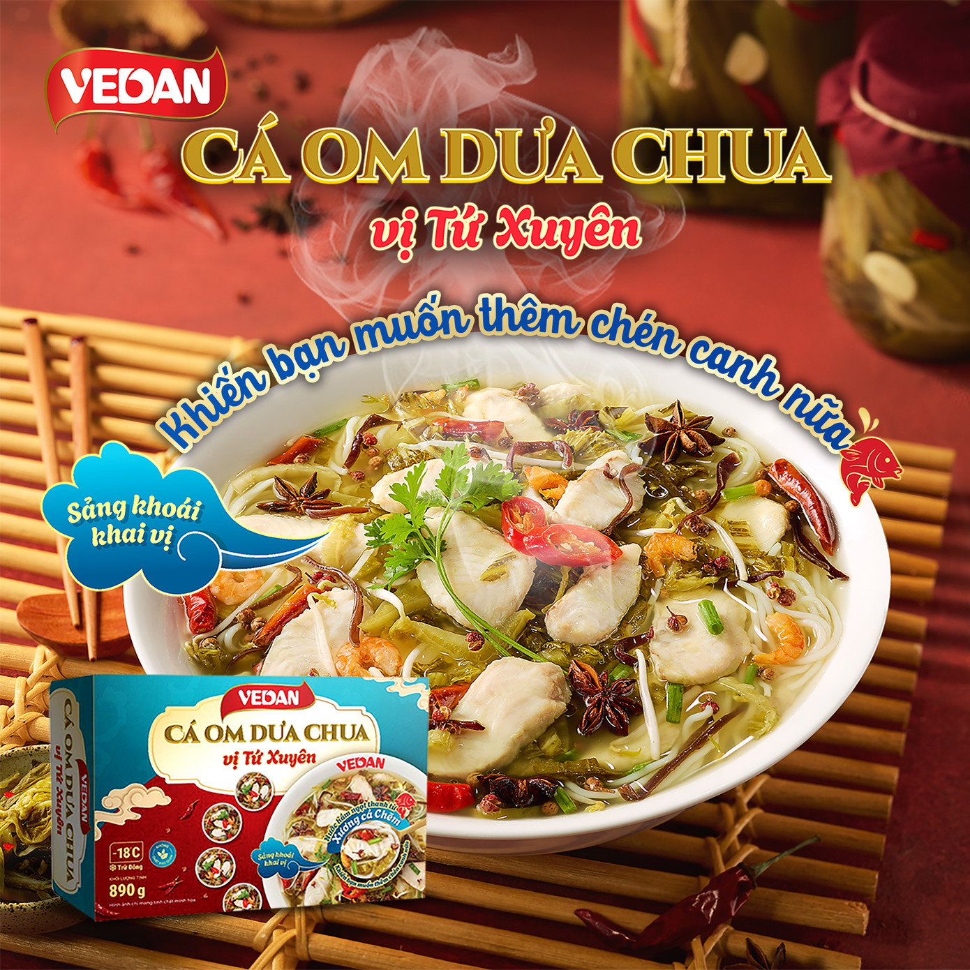 Vì vậy, đội ngũ VEDAN trong quá trình phát triển thực phẩm đông lạnh cũng cố gắng tận dụng nguyên liệu địa phương để tạo nên các món ngon đặc trưng Việt Nam. Chẳng hạn như món “Cá Om Dưa Chua Vị Tứ Xuyên VEDAN” là sự kết hợp giữa sản phẩm xuất khẩu hàng đầu thế giới - Cá Tra phi lê, với bún Việt Nam… và nước dùng được hầm từ xương Cá Chẽm.