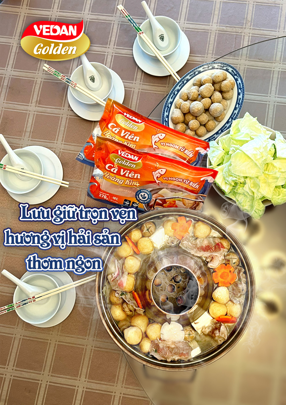 Món ăn tiện lợi và ngon nhất trên thế giới chính là “lẩu”. Trong loạt sản phẩm ra mắt đầu tiên của VEDAN, bạn có thể tìm thấy được hai loại sản phẩm Cá Viên Hoàng Kim VEDAN Golden - Nguyên Vị (không nhân), và Nhân Trứng Muối, khi dùng chung với lẩu sẽ thể hiện hoàn hảo hương vị tuyệt vời nhất của cá viên hoàng kim. Cá Viên Hoàng Kim VEDAN Golden được tuyển chọn khắt khe từ nguồn nguyên liệu surimi thượng hạng đến từ đại dương (cá đổng). Sau khi chiên bằng kỹ thuật công nghệ sẽ lưu giữ được trọn vẹn hương vị hải sản thơm ngon, hương vị đậm đà, dai ngon vừa miệng.