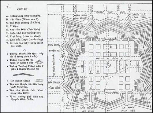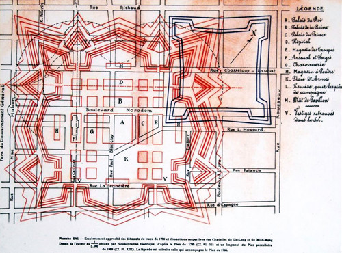 Màu đỏ là thành Bát quái xây năm 1790, bị vua Minh Mạng phá đi năm 1835. Màu xanh là thành Phụng, xây năm 1836 bị quân Pháp san bằng hơn 20 năm sau đó. Màu đen là các con đường của Sài Gòn sau này với tên đường trong thời Pháp thuộc. Ảnh tư liệu