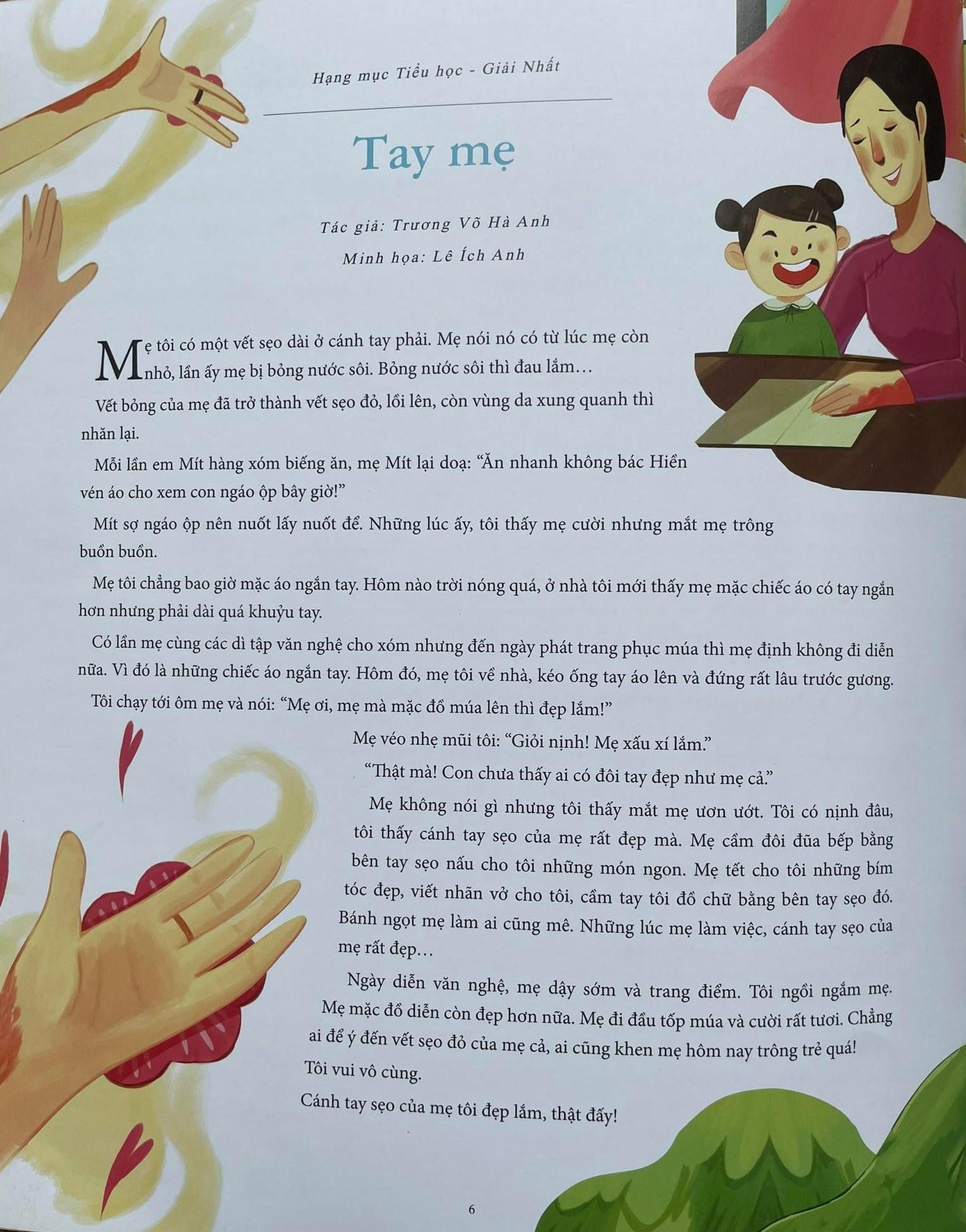 Trương Võ Hà Anh nói rằng mẹ cô bé luôn tự ti về vết sẹo do bỏng nước sôi từ nhỏ, nhưng trong mắt cô bé mẹ lúc nào cũng đẹp. Tay mẹ làm ra món ngon và càng đẹp hơn khi mẹ làm việc. Chính cái nhìn yêu thương với vết sẹo trên tay mẹ đã làm lay động độc giả và giám khảo.