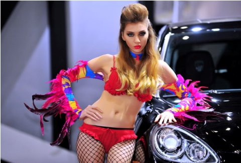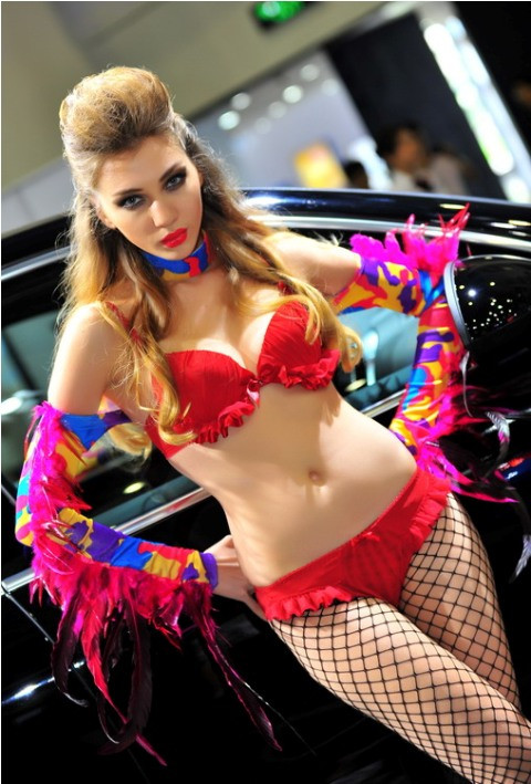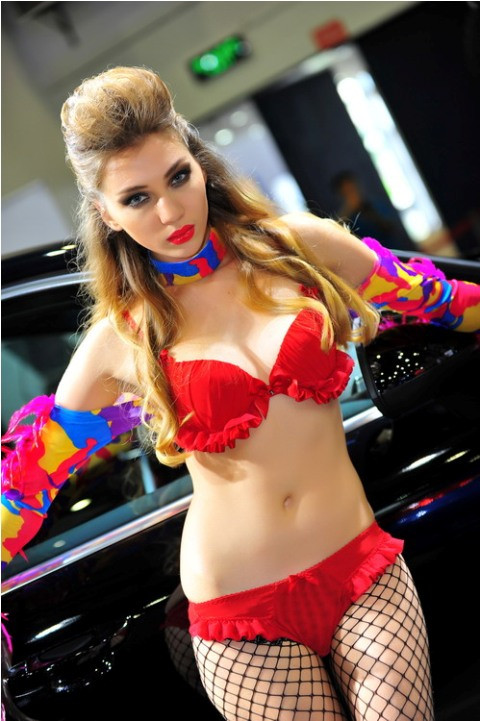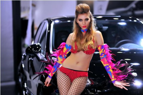 TPO - Trong bộ quần áo nhiều màu sắc sặc sỡ như những chú vẹt, cô người mẫu khoe dáng ấn tượng bên cạnh xế hộp.
