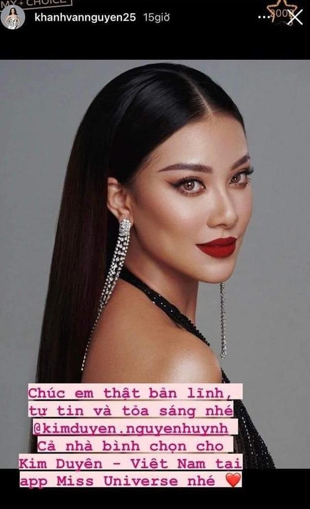Chưa kể Khánh Vân đã từng có hẳn buổi livestream về chuyện Kim Duyên đi thi Miss Universe 2021, giải thích rằng vì cô quá bận rộn lịch trình cuối năm nên không thể đi cùng Kim Duyên sang Israel để hỗ trợ đàn em. Hoa hậu Khánh Vân đành chọn cách ủng hộ hết công suất và truyền tình yêu của cô sang Israel để chúc Kim Duyên thi thật tốt.