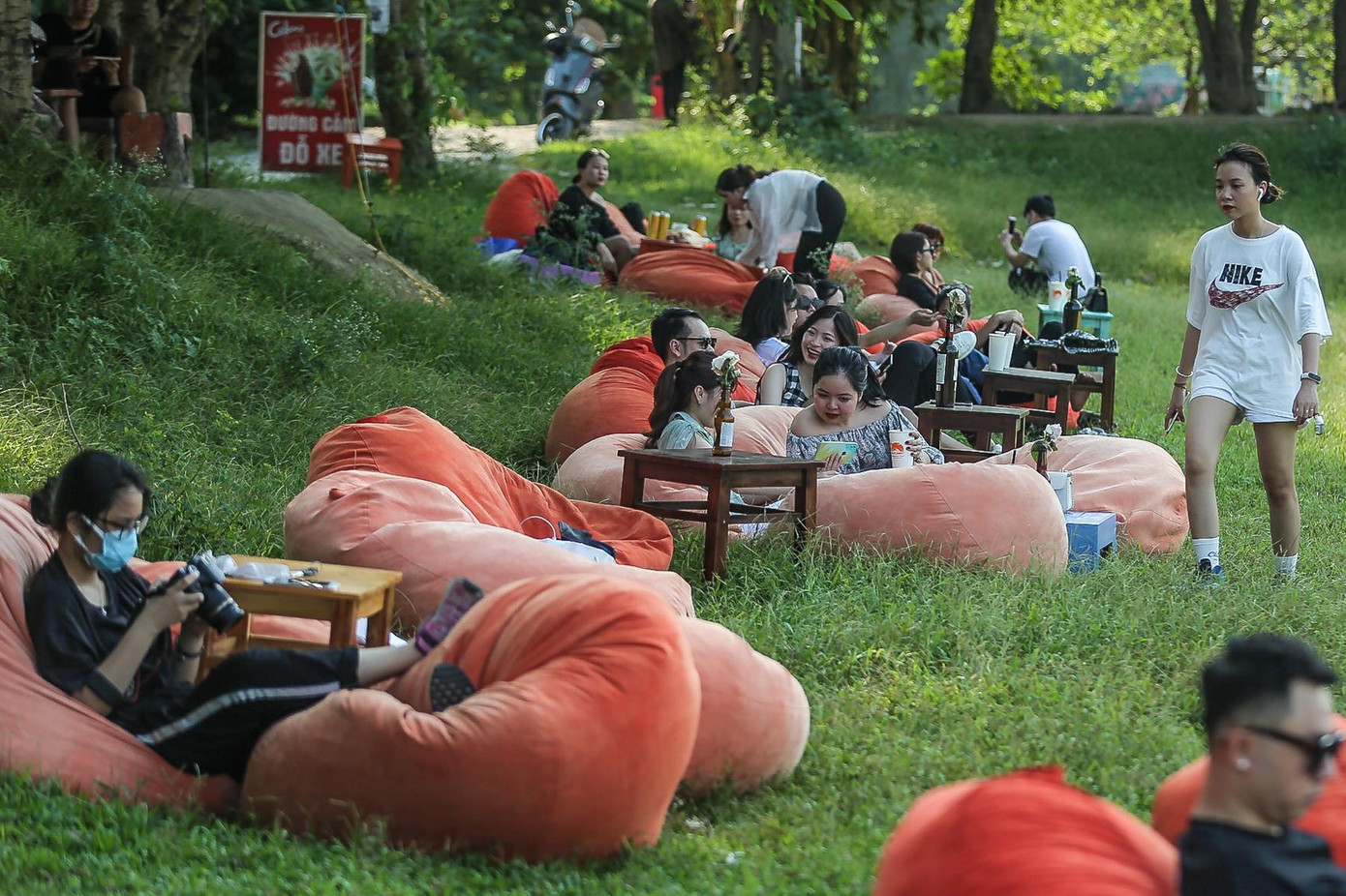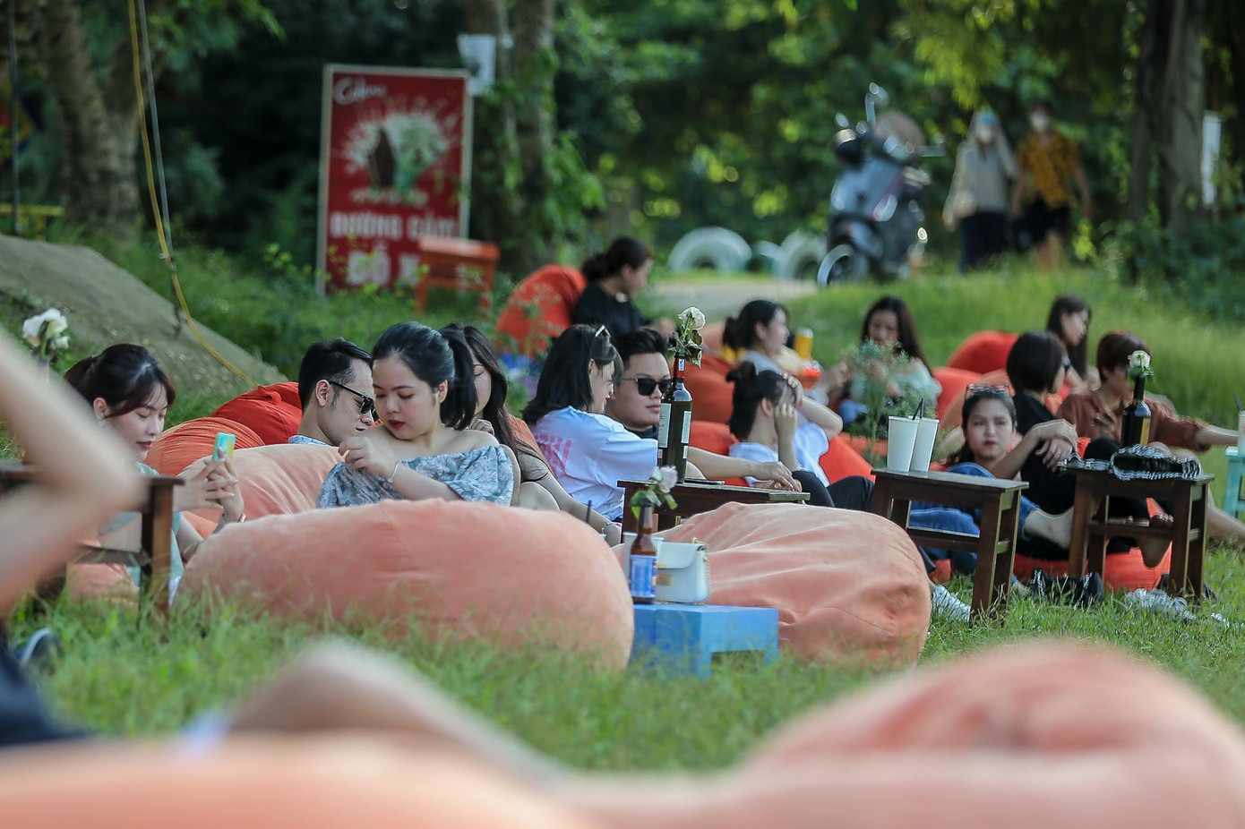 Càng về chiều tối, lượng người đổ về bãi đá sông Hồng càng đông, nhiều người tụ tập tại khu vực trên với lều trại, bóng đèn bếp nướng biến nơi đây thành nơi cắm trại lý tưởng giữa mua dịch COVID-19.