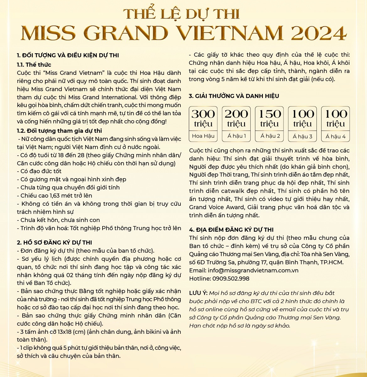 Công ty Sen Vàng, đơn vị năm bản quyền Miss Grand tại Việt Nam mới đây đã chính thức công bố thể lệ cũng như giải thưởng của cuộc thi Miss Grand Vietnam 2024.