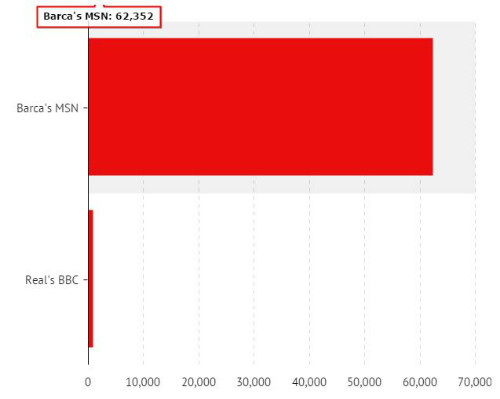 Trái ngược, bộ ba MSN của Barca (Lionel Messi - Neymar - Luis Suarez) lại im tiếng. Suarez sút trượt bóng trong tình huống tưởng ăn bàn ở phút 12. Messi lùi sâu và Neymar ít tạo ảnh hưởng. Sự im lặng ở El Clasico khác hẳn với phong độ hủy diệt của MSN mọi khi, vốn giúp họ ghi tổng cộng 107 bàn từ đầu mùa này.