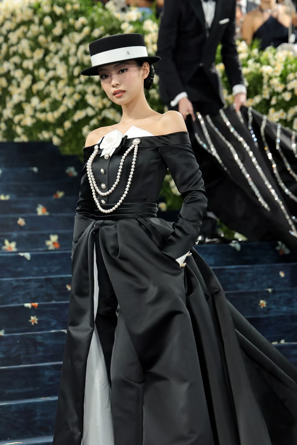Sang trọng, quý phái là những tính từ được dùng để mô tả về Jennie trong lần trở lại Met Gala 2025. Giọng ca Mantra diện mẫu đầm tuxedo được may đo riêng của thương hiệu Chanel, tô điểm với chi tiết hoa trà camellia, ngọc trai. Trang phục lấy cảm hứng từ thiết kế thuộc BST Thu Đông 1987 của NTK Karl Lagerfeld. Để hoàn thiện vẻ ngoài cổ điển, nữ đại sứ toàn cầu Chanel lựa chọn kiểu tóc búi thấp, đội mũ boater đen - trắng.