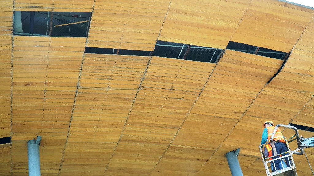 Sau một thời gian thi công và đưa vào sử dụng, những ngày gần đây, nhiều người dân và du khách khi vãn cảnh, tham quan trên đường đi bộ ven sông Hương đoạn gần khu vực cồn Dã Viên, ga Huế, đường Bùi Thị Xuân và Học viện Âm nhạc Huế không khỏi bất ngờ khi chứng kiến phần trần gỗ ốp phía dưới tấm lợp tại khu vực rìa mái bao quanh Nhà hát sông Hương đã nhanh chóng xuống cấp, hư hỏng, rơi rụng… để lộ ra những mảng trống nhìn thấu các kết cấu xà đỡ bằng kim loại và tấm lợp bên trong.