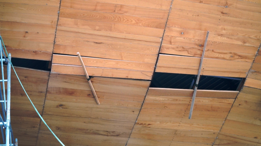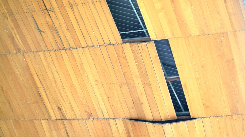 Gió bão đã cuốn bay mất một phần mái lợp kim loại bằng tôn đặc chủng (tôn Kliplock) bên trên nhà hát, khiến nước mưa thấm xuống trần gỗ ốp trên phần rìa mái ngoài của nhà hát.