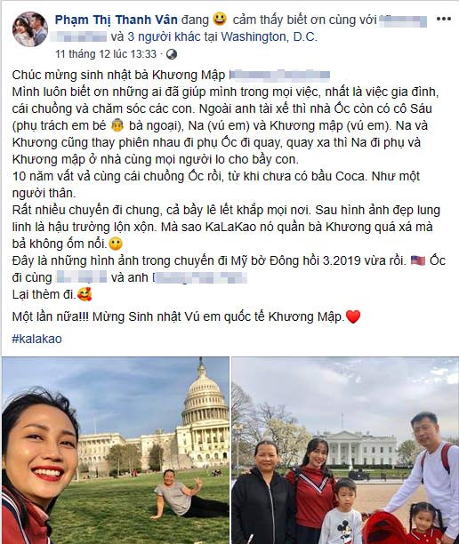 Cùng với bài viết, Ốc Thanh Vân đã đăng tải những hình ảnh của gia đình và người giúp việc trong chuyến đi Mỹ hồi tháng 3 vừa qua.