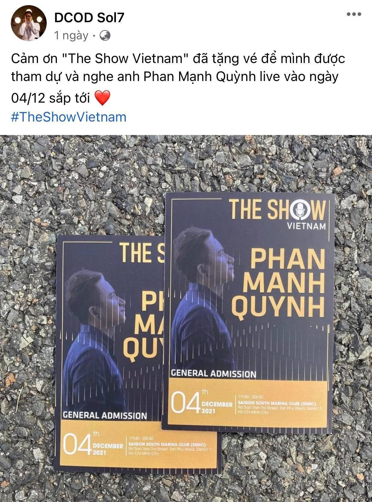 Chưa dừng lại ở đó, các nam rapper từng "làm mưa làm gió" tại Rap Việt như “Thầy Bảy” Sol7 hay RTee cũng bất ngờ chia sẻ những tấm vé cho đêm diễn mở màn của The Show Vietnam vào chiều tối 4/12.