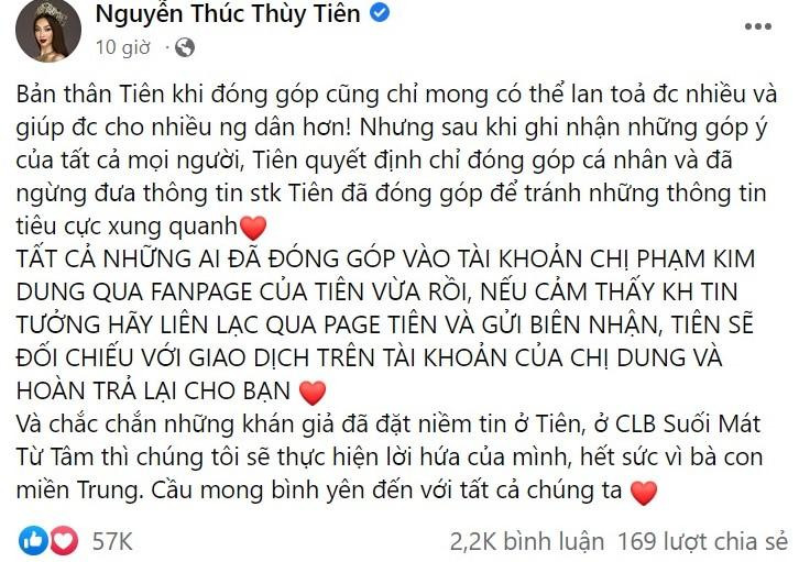 Theo các bình luận góp ý, điều khó hiểu là việc Thùy Tiên kêu gọi quyên góp vào một tài khoản cá nhân của của câu lạc bộ thiện nguyện "Suối mát từ tâm" do “bà trùm Hoa hậu” Phạm Kim Dung tổ chức. Thùy Tiên có chia sẻ: “Chị Phạm Kim Dung sẽ trích từ quỹ từ thiện 500 trăm triệu đồng và vận động thêm các mạnh thường quân, các nhà hảo tâm để giúp đỡ bà con. Và chắc chắn, các thành viên trong CLB bao gồm cả Tiên, các Hoa hậu, Á hậu sẽ lên đường đến thăm miền Trung sau đêm Chung kết Miss Grand Vietnam - Hoa hậu Hoà bình Việt Nam 2022. Thuỳ Tiên xin gửi 50 triệu đồng vào tài khoản từ thiện của câu lạc bộ. Triệu con tim người Việt vẫn luôn hướng về, cố lên miền Trung ơi. Cầu mong bình an đến với người dân”.