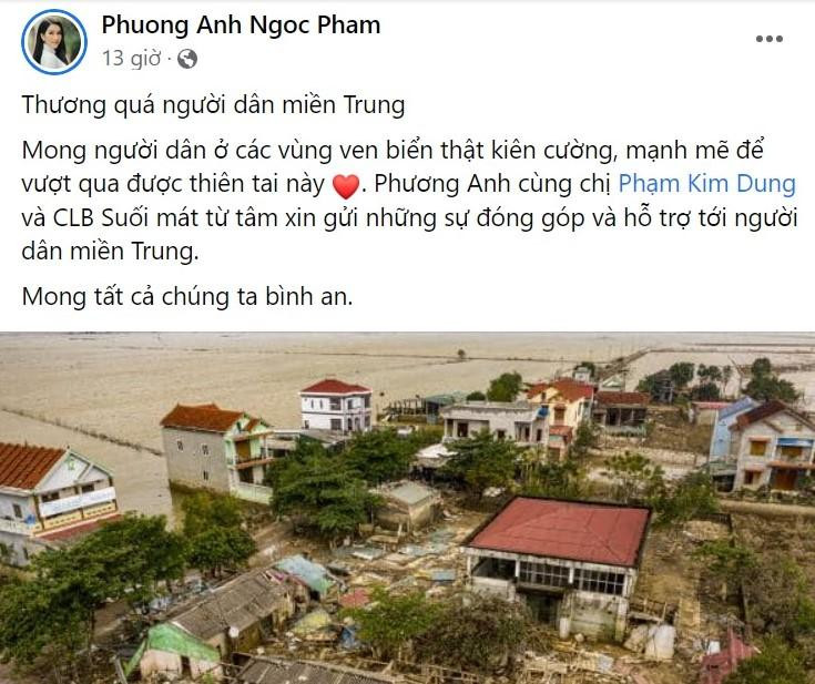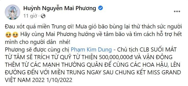 Cộng với số tiền trích từ quỹ câu lạc bộ là 500 triệu đồng cùng những đóng góp của bạn bè, người thân, đối tác, và của chính các Hoa, Á Hậu và sẽ làm việc với chính quyền các địa phương để đi gửi đến từng người dân có tổn thất. Bà Kim Dung Sẽ thông tin đầy đủ đến các mạnh thường quân từng thông tin đóng góp và từng thông tin nhận hỗ trợ. Mong bão sẽ tan nhanh và ít tổn thất nhất để bà con không bị khó khăn.
