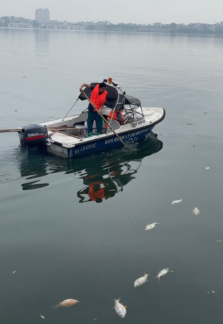 Đại diện UBND quận Tây Hồ cho biết, thời gian tới, UBND quận Tây Hồ tiếp tục chỉ đạo UBND các phường xung quanh hồ và các đơn vị chức năng tiếp tục theo dõi, phối hợp, đôn đốc Công ty TNHH MTV Thoát nước Hà Nội tăng cường thu vớt cá chết từ xa trước khi dạt vào bờ nhằm giảm thiểu ô nhiễm nước hồ và đảm bảo cảnh quan; tăng cường lực lượng từ UBND các phường và các đơn vị khác tham gia phối hợp thu vớt xác cá chết trong trường hợp cá cá chết nhiều.