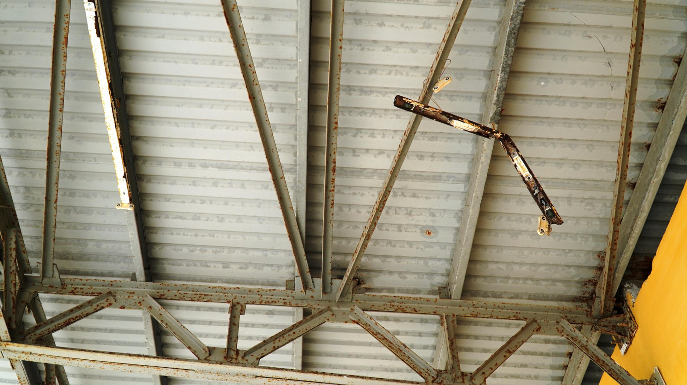 Mặt khán đài xuống cấp, bê tông bong tróc trơ lõi sắt thép bên trong.